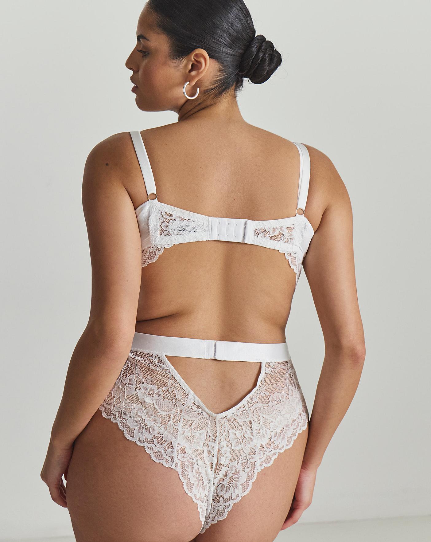 In a delicate all-over lace, the new Planet Hold Me Tight Body combines the beautiful simplicity of sheer underwired cups and a scalloped edge brazilian brief with low back cut-out detail for a barely there coverage. Cinched in with a stretch elasticated panel at the waist for incredible hourglass shaping. Our Planet collection is made from a minimum 30% recycled fibres and mesh that contains 50% recycled yarns. The updated styling is better for the planet, and made for every day, every night and every body.