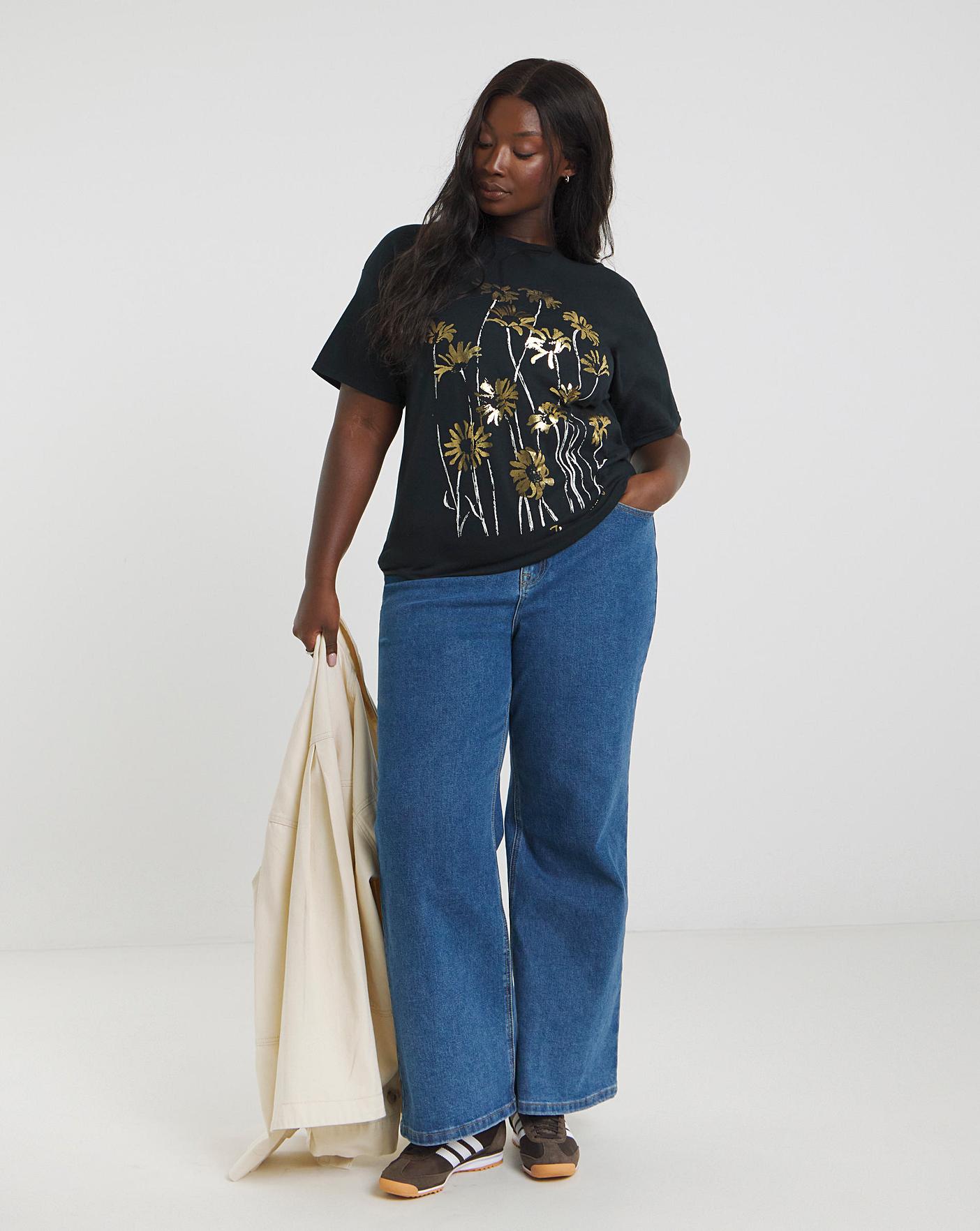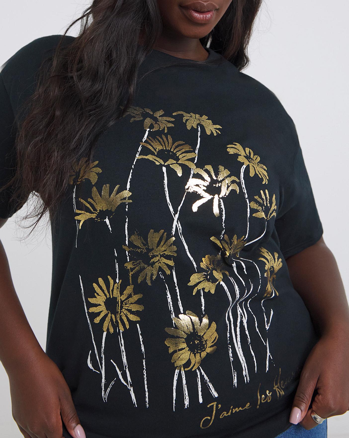 Elevate your graphic t-shirt collection with our elegant floral foil print t-shirt. Featuring gold foil print, floral graphic, black base colour, soft and comfortable cotton fabric, oversized fit, crew neckline, and short sleeves. Pair with jeans for an effortless everyday look!