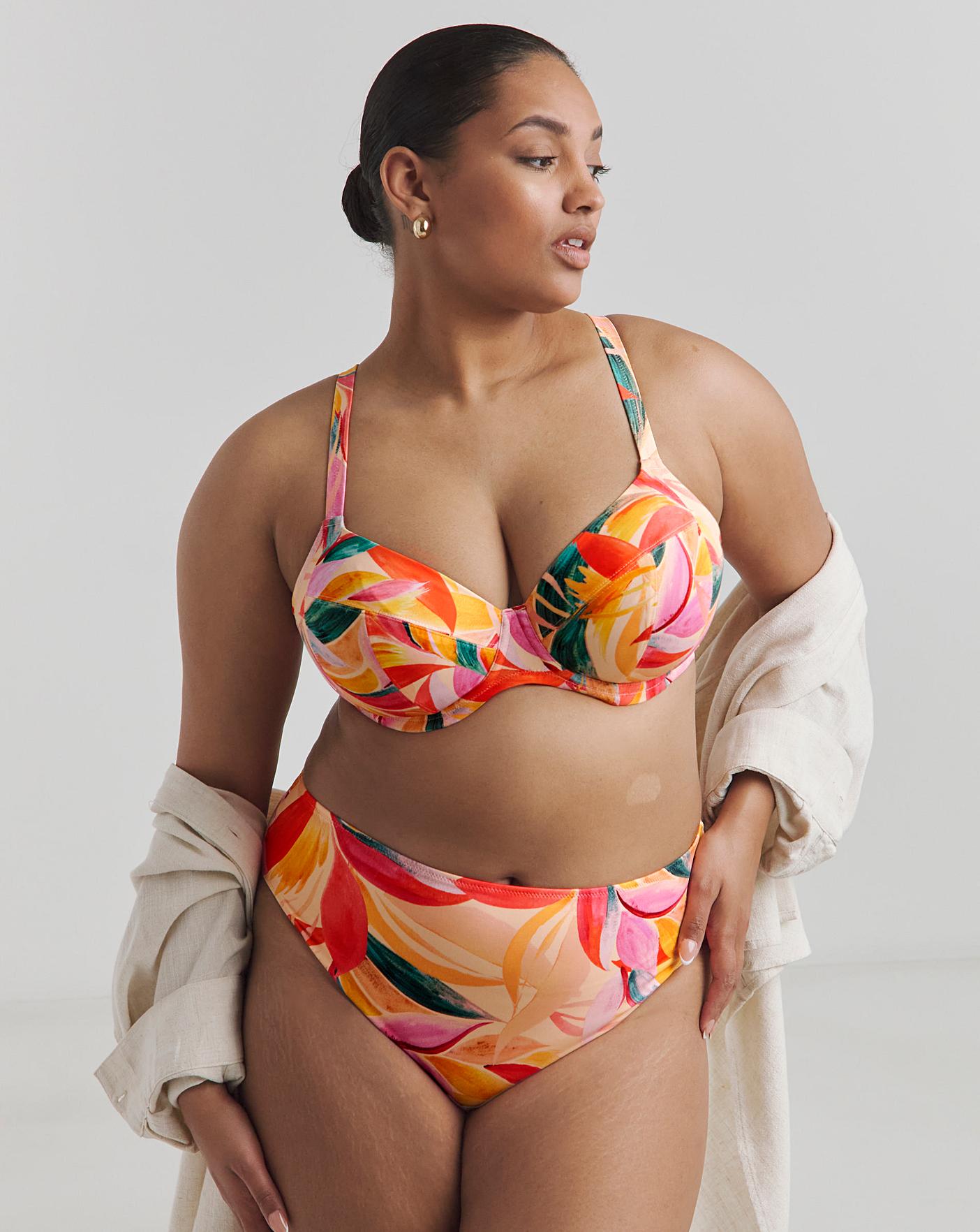 Transport yourself to sunnier shores with Sancho Beach. Featuring a painterly leaf design, the print is energised by a fusion of zesty mango and mandarin tones. Waist height brief has been cut from a lightweight printed fabric with LYCRA XTRA LIFE. Fully lined. Pair up with the matching bikini top for a zesty beach set.