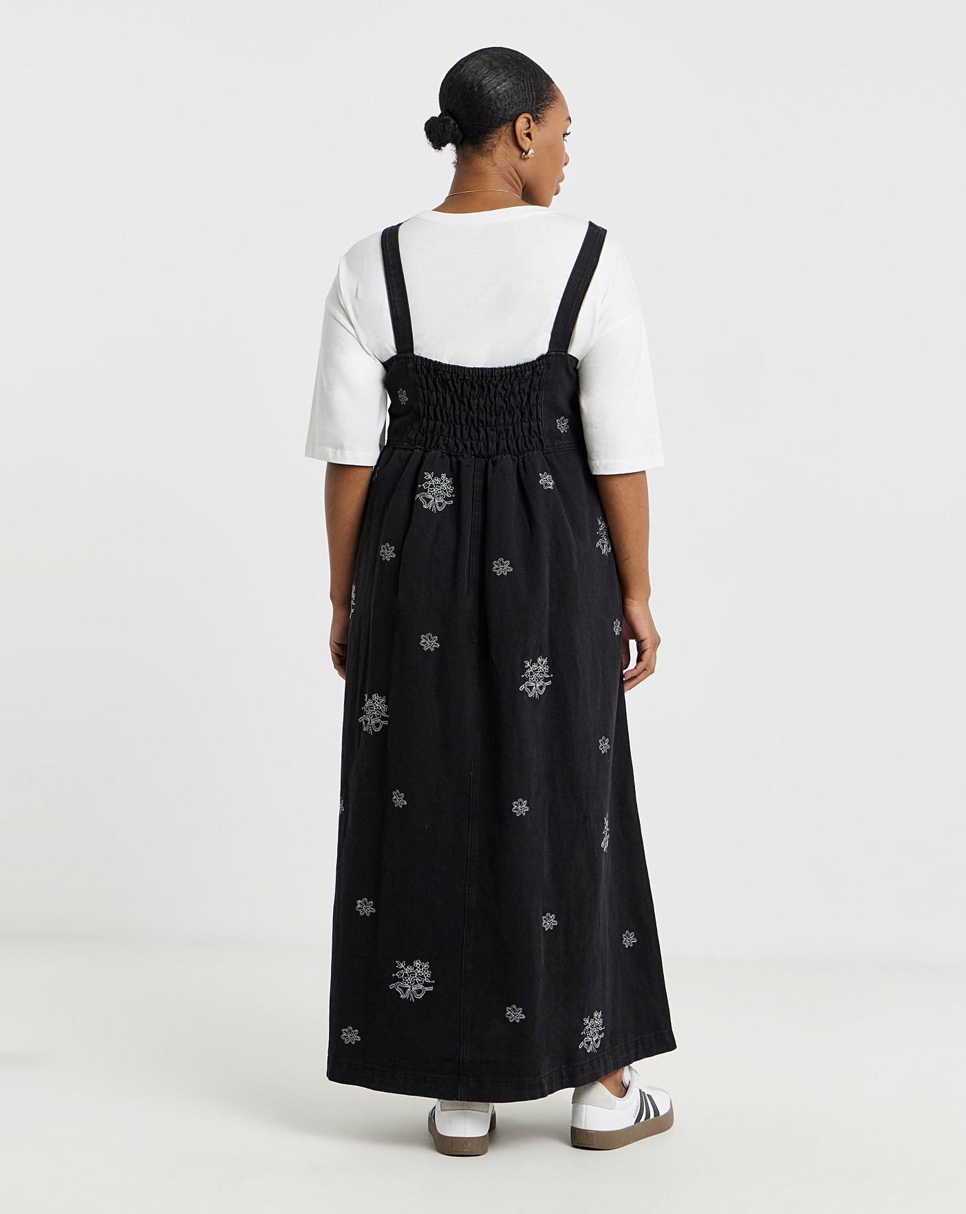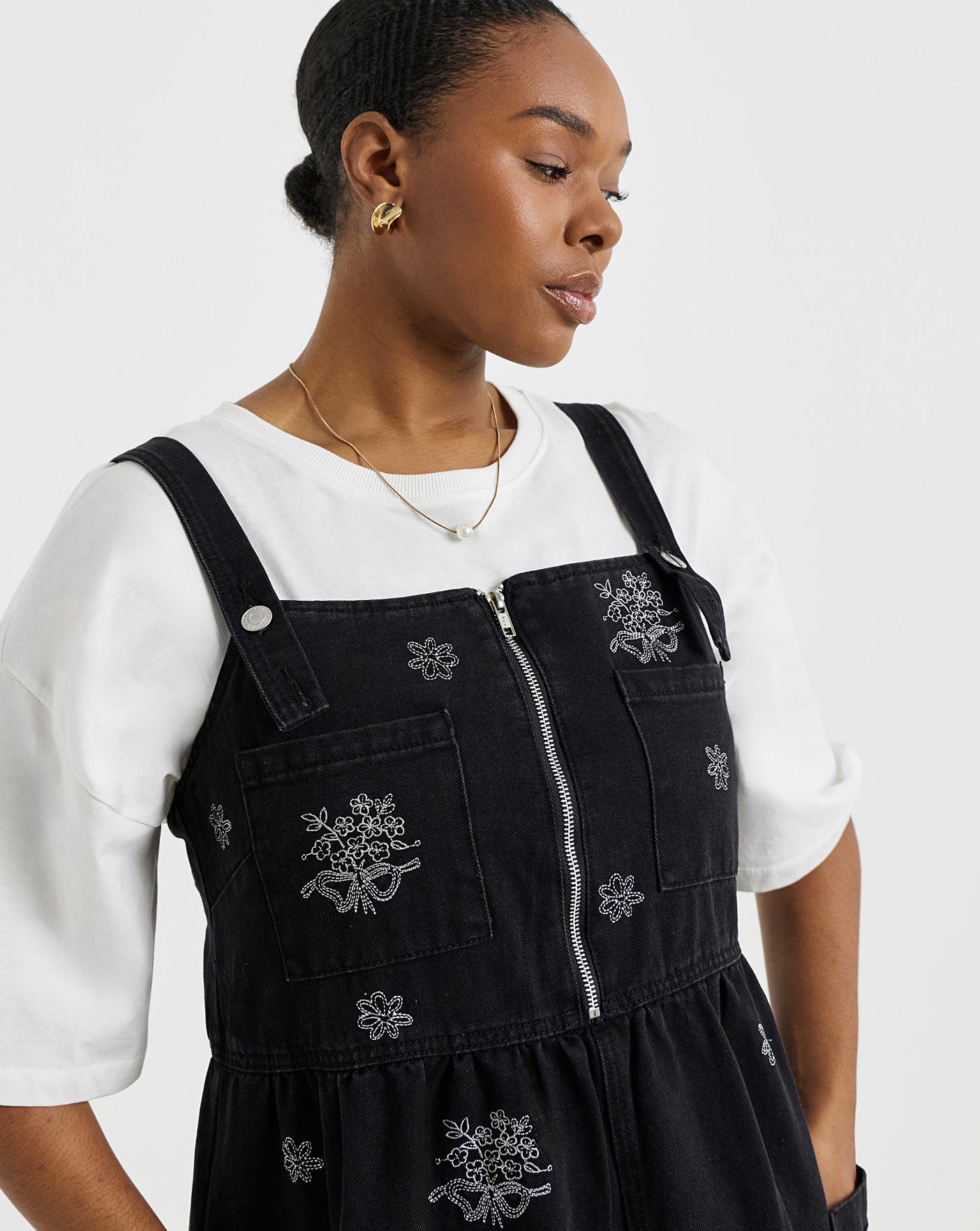 This embroidered dress is the perfect wradrobe addition this season! Simply partner over a long sleeve tee and style with chunky boots. It features beautiful fruit embroidery, adjustable shoulder straps, front pockets, and is a dark wash fabric.