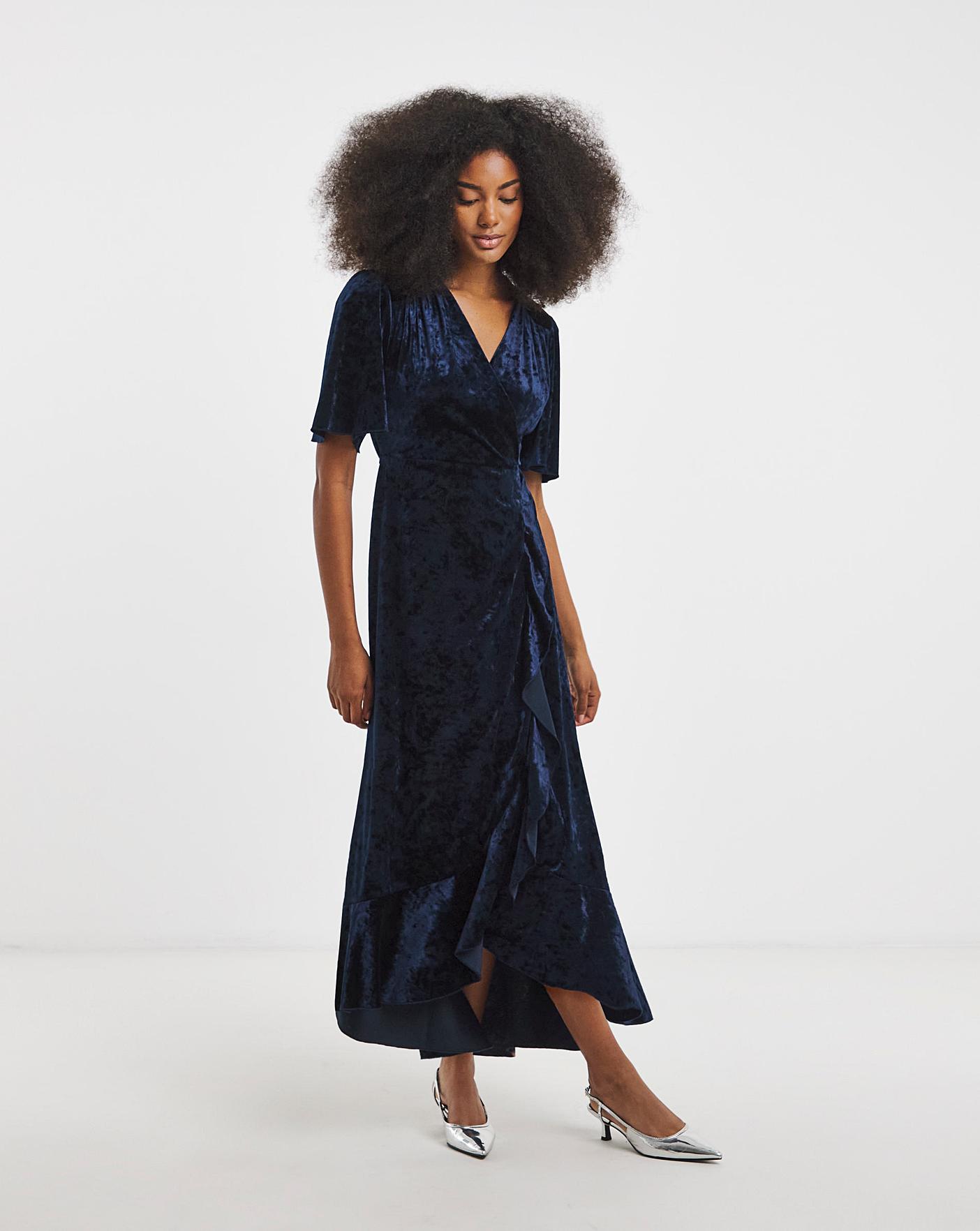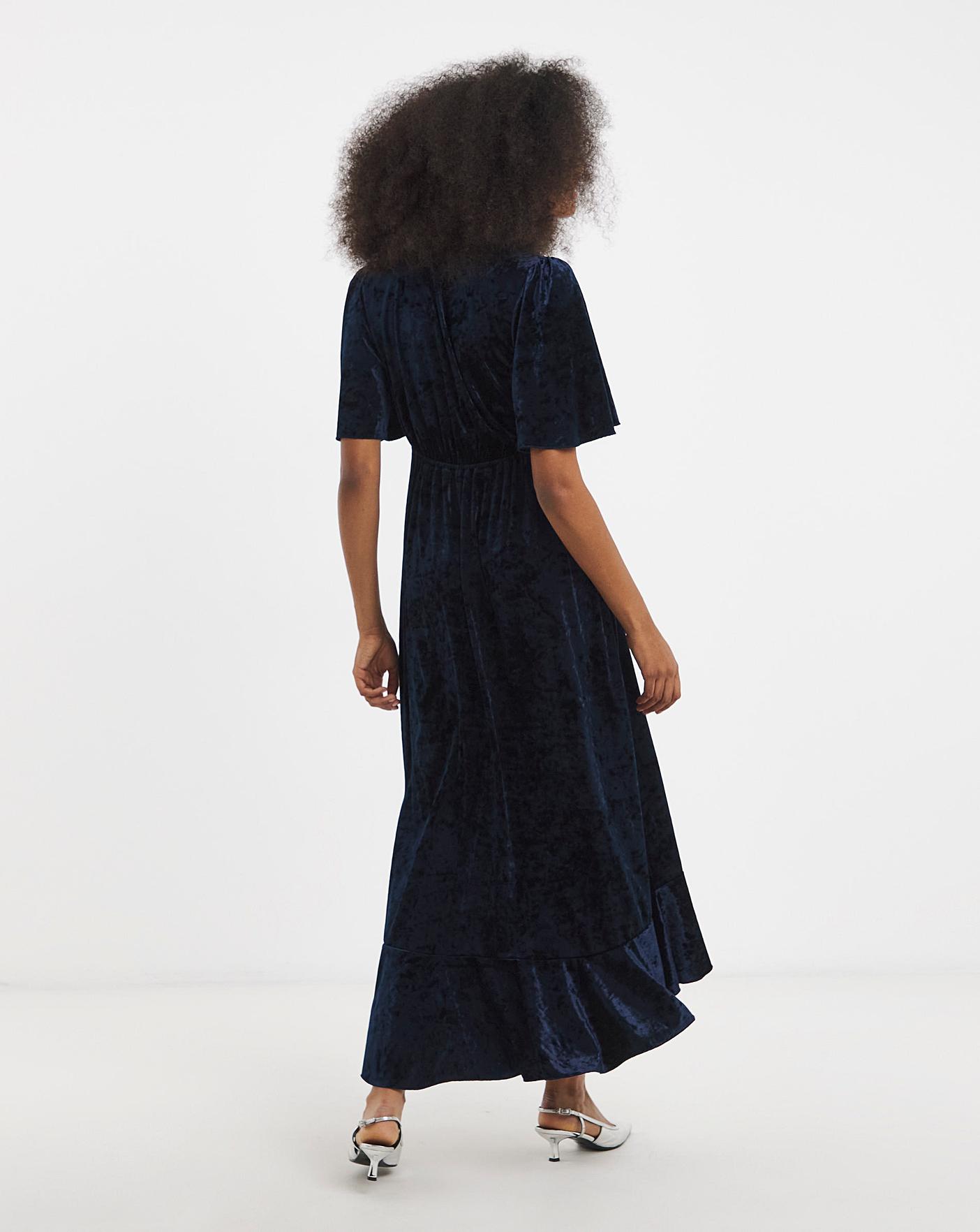 Flounce London flutter sleeve midaxi dress in blue crushed velvet. This dress features a flutter sleeve, waterfall hem and elasticated back making it comfortable and flattering for all shapes. Perfect for a winter wedding or Christmas party.