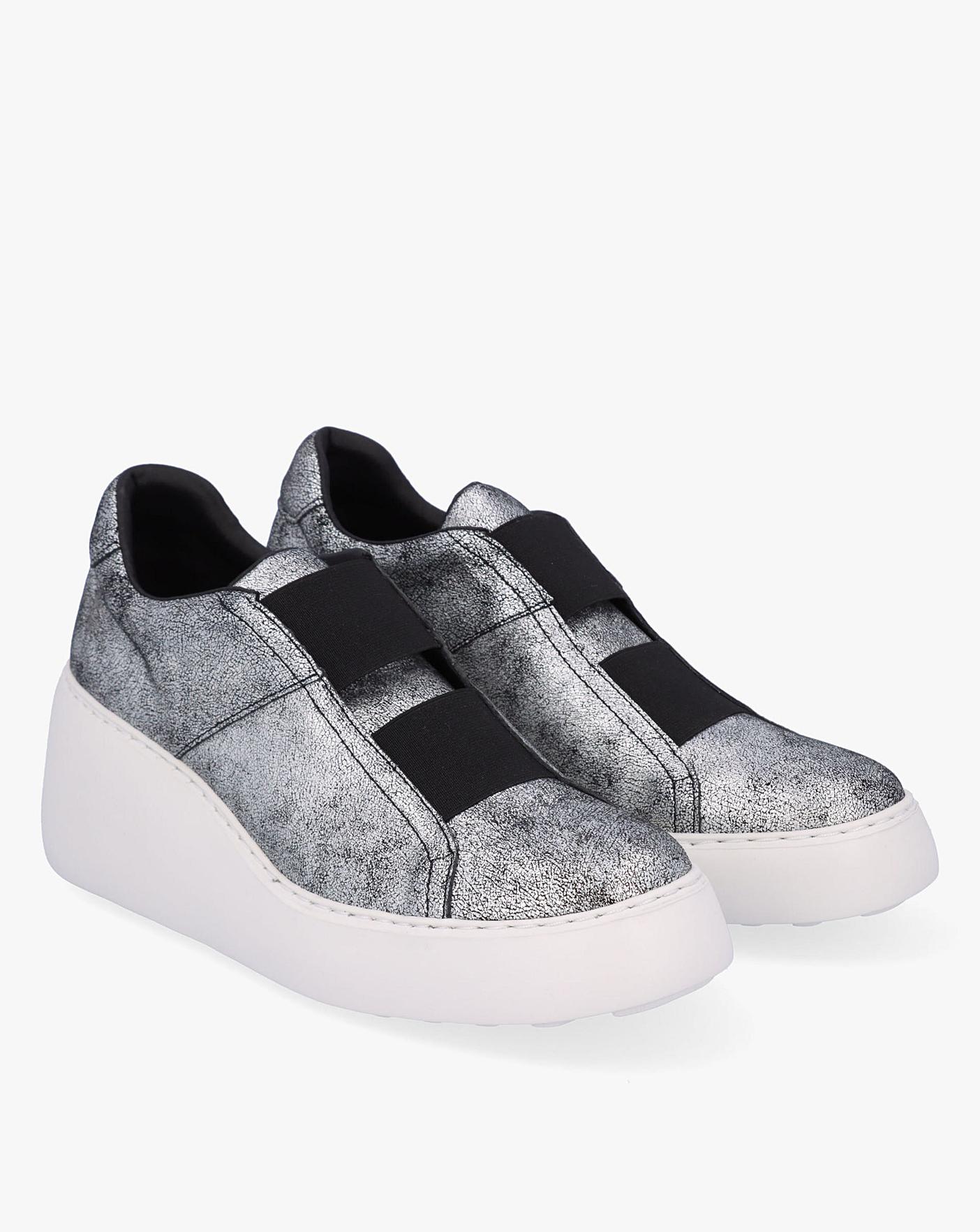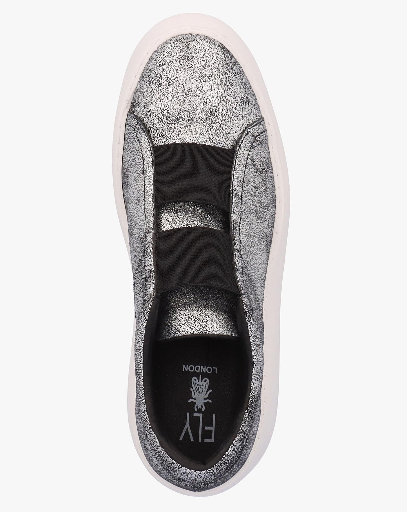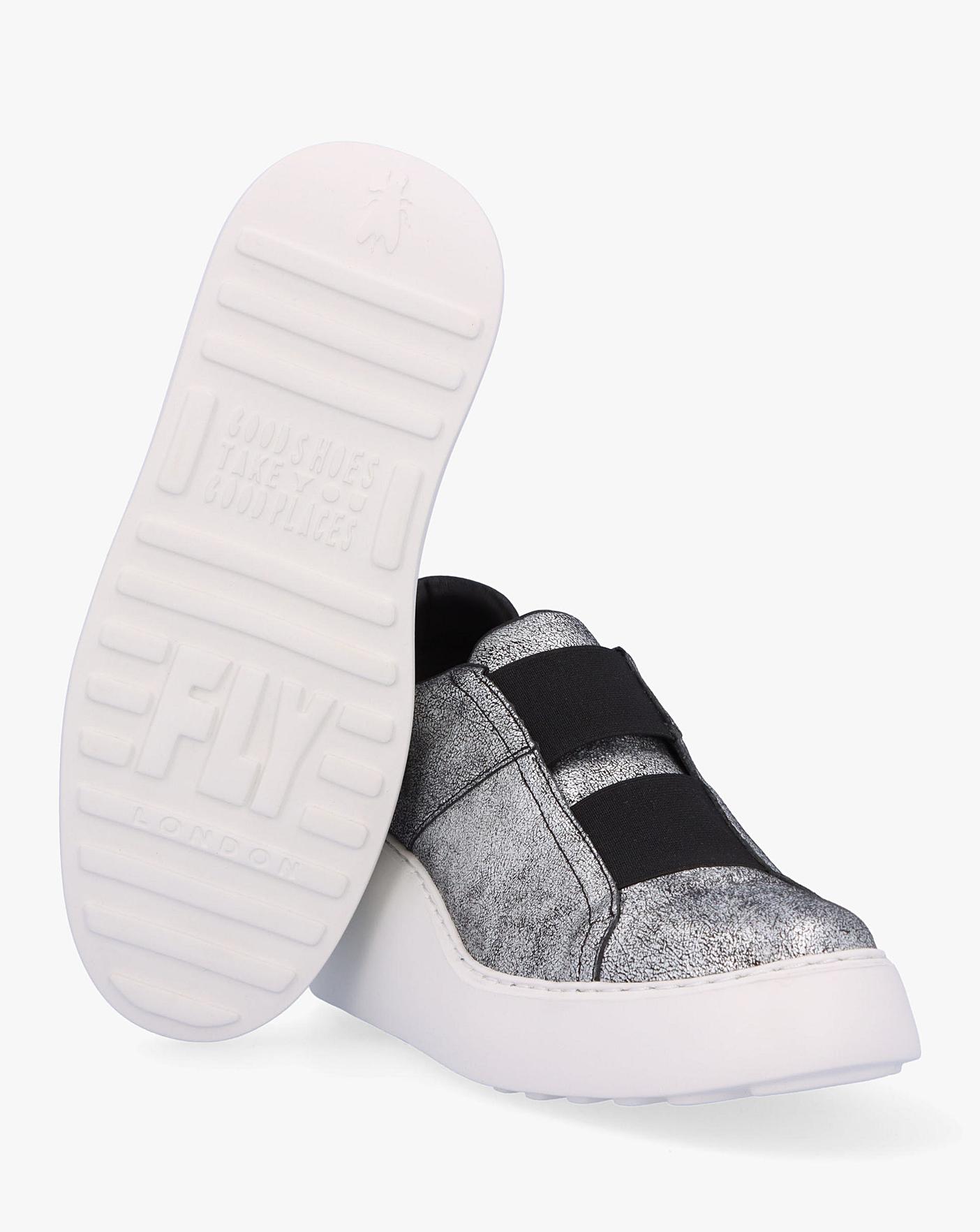 • The Fly London Dito II Silver Leather Wedge Trainers are a fashion sporty style and a welcome addition to your off-duty wardrobe. This New Season style is crafted from a premium cracked leather upper with part leather lining and rubber sole. The round toe and wedge sole make up the silhouette. An easy to wear slip on style featuring elasticated inserts to the upper. Classic embossed logo adds detail. Signature Fly London branding completes the design.