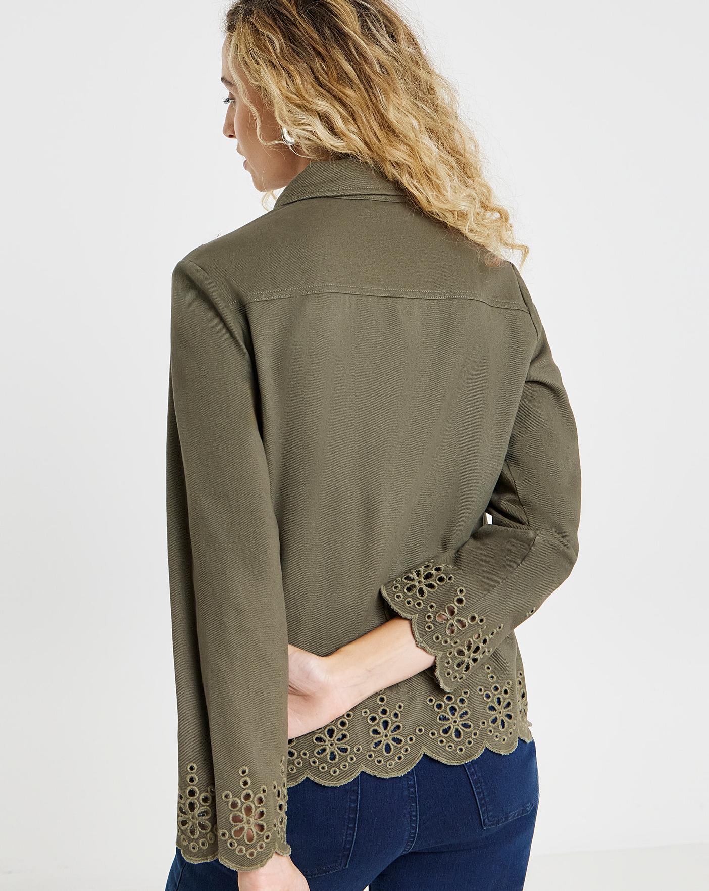 Featuring delicate cut out detail and a pretty scalloped hem, this denim jacket will bring luxury to your summer wardrobe. You'll love how this jacket colour will go with anything, dresses, skirts, jeans, pinafores, you choose. Finished in a flattering, relaxed shape, you'll look incredible, however you style it.