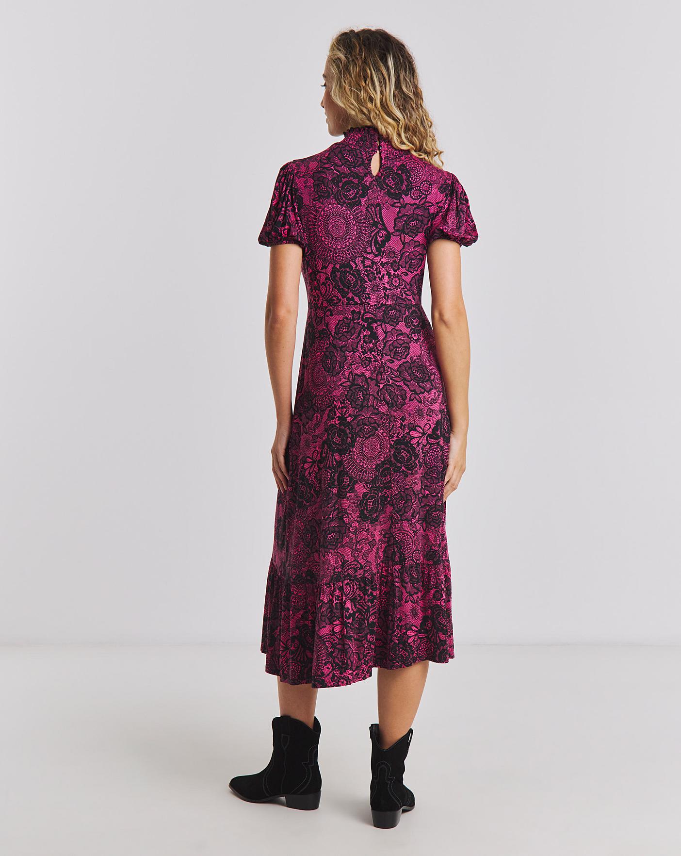 A high-neck jersey dress is the perfect way to elevate your winter wardrobe. Here, the vintage-inspired lace print works with the frills and pink colourway to create a piece that's flattering, feminine and oh so fabulous. You'll have endless style options too - with boots, heels or retro Mary Janes, you can really make this look your own.