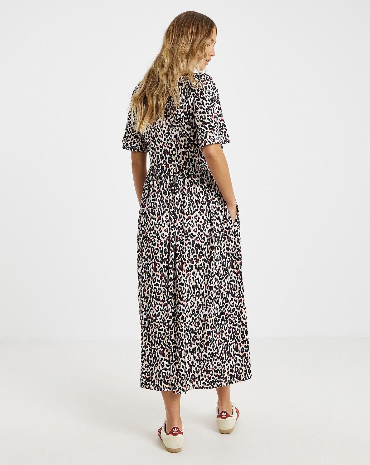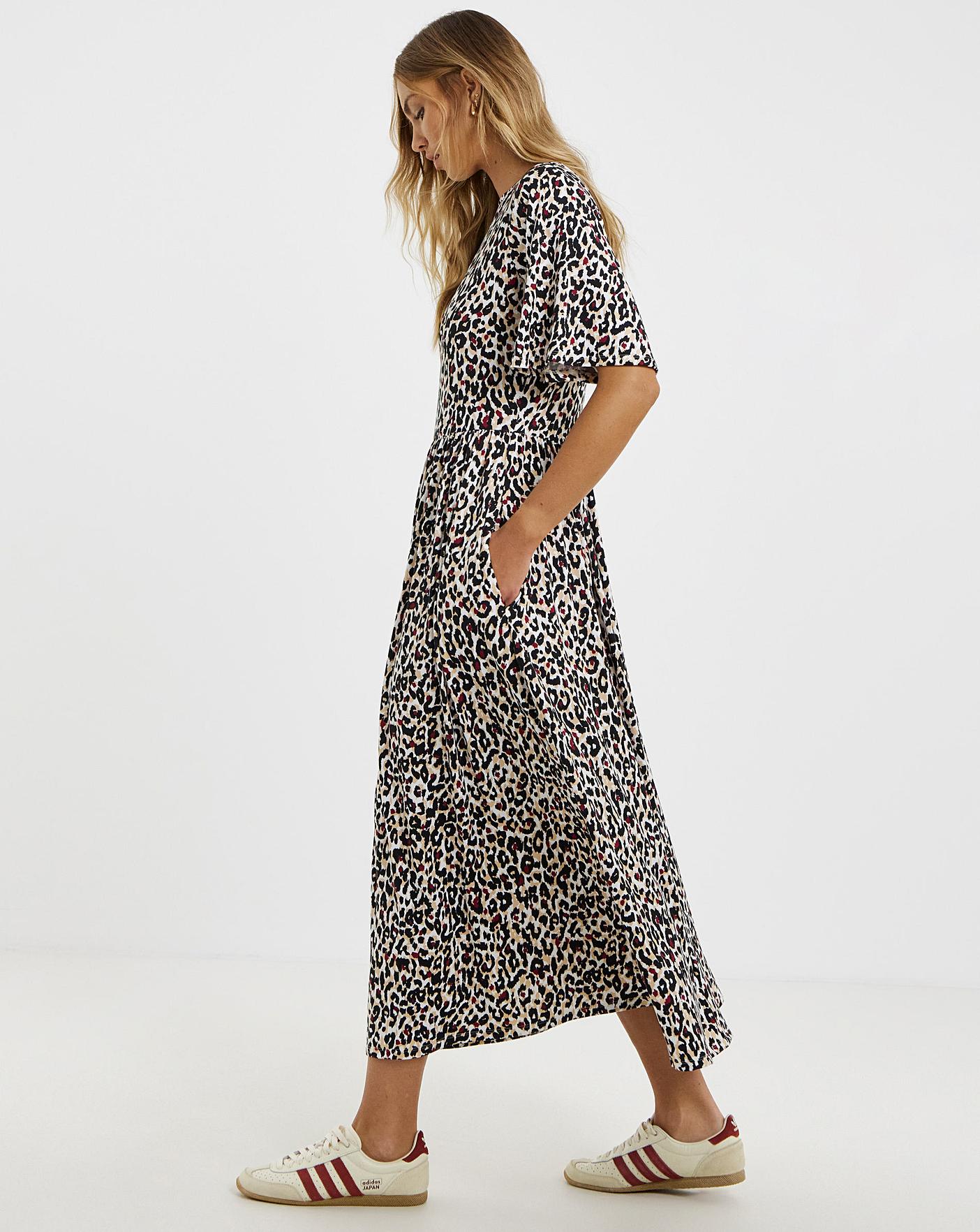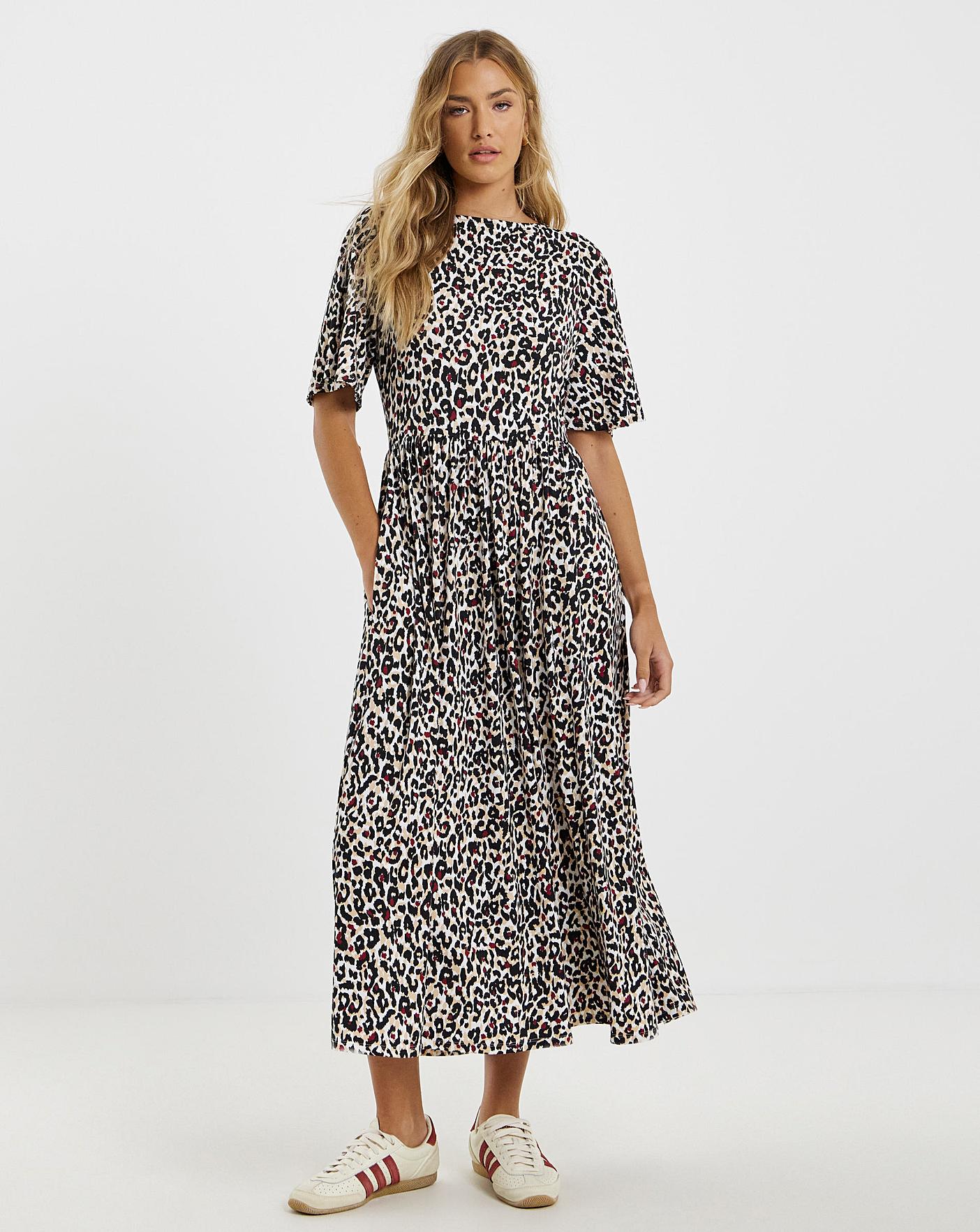 Update your wardrobe with this lovely midaxi dress. In our best selling supersoft jersey fabric. On trend animal print. Boxy short sleeves. Boat neckline. Simply style with trainers for an easy daytime look!