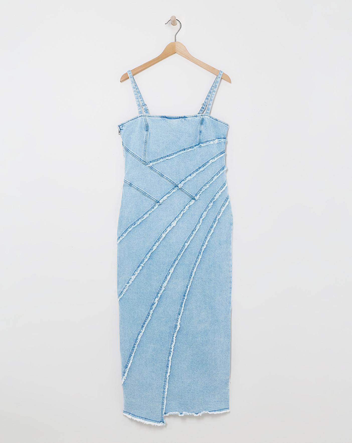 The perfect transitional denim maxi dress. It features a true maxi length, light blue denim wash, and back split. Simply wear with a bodysuit or on its own, and pair with trainers.
