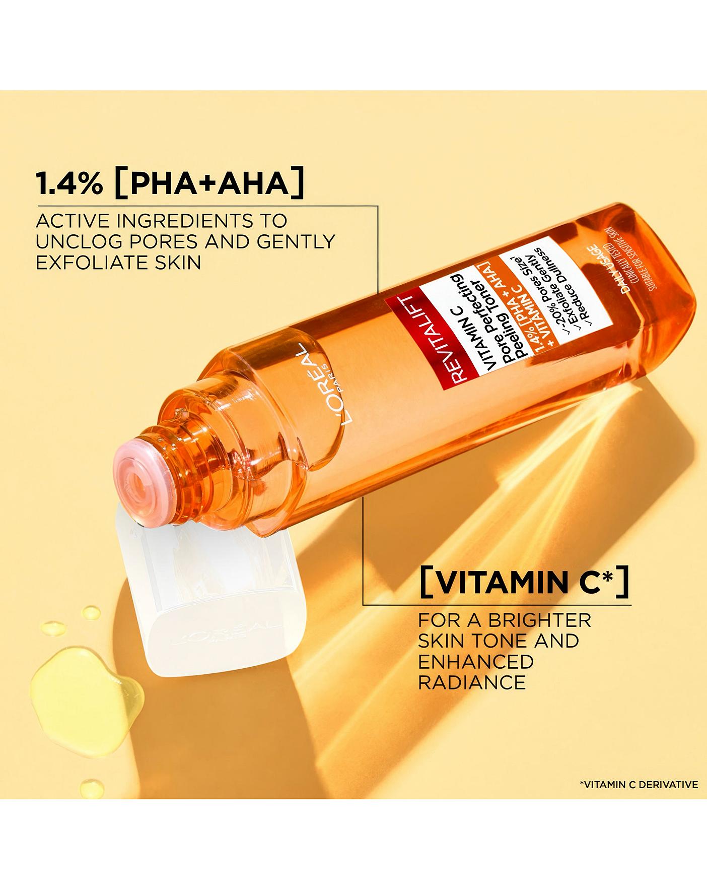 Shrink pores and reduce dullness with the L'Oreal Paris Bright Reveal Vitamin C Pore Perfecting Peeling Toner. A daily exfoliating shot of Vitamin C with a powerful yet gentle blend of antioxidants and acids. Visible Results: Immediately: Daily impurities such as oil, pollution and dust are removed. Skin is visibly smoother. Over time: Pores look unclogged. Skin texture is visibly refined. Skin tone looks more even & radiant. Key Ingredients include PHA + AHA: Derm-recommended actives to unclog pores & gently exfoliate skin. Vitamin C: Known to brighten skin tone and enhance radiance. Vitamin C derivative.Suitable for All: Formulated for all skin tones and types, even sensitive skin.