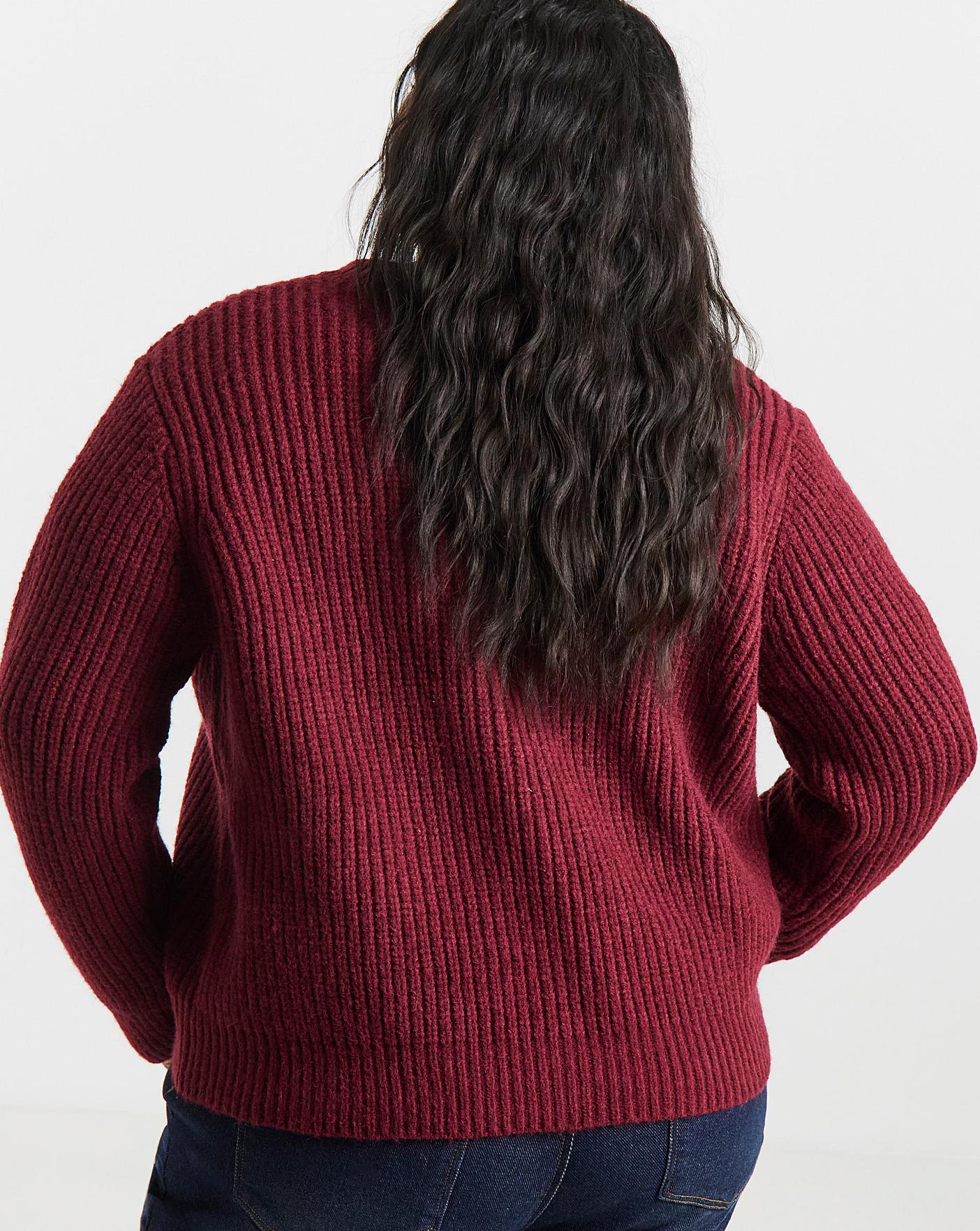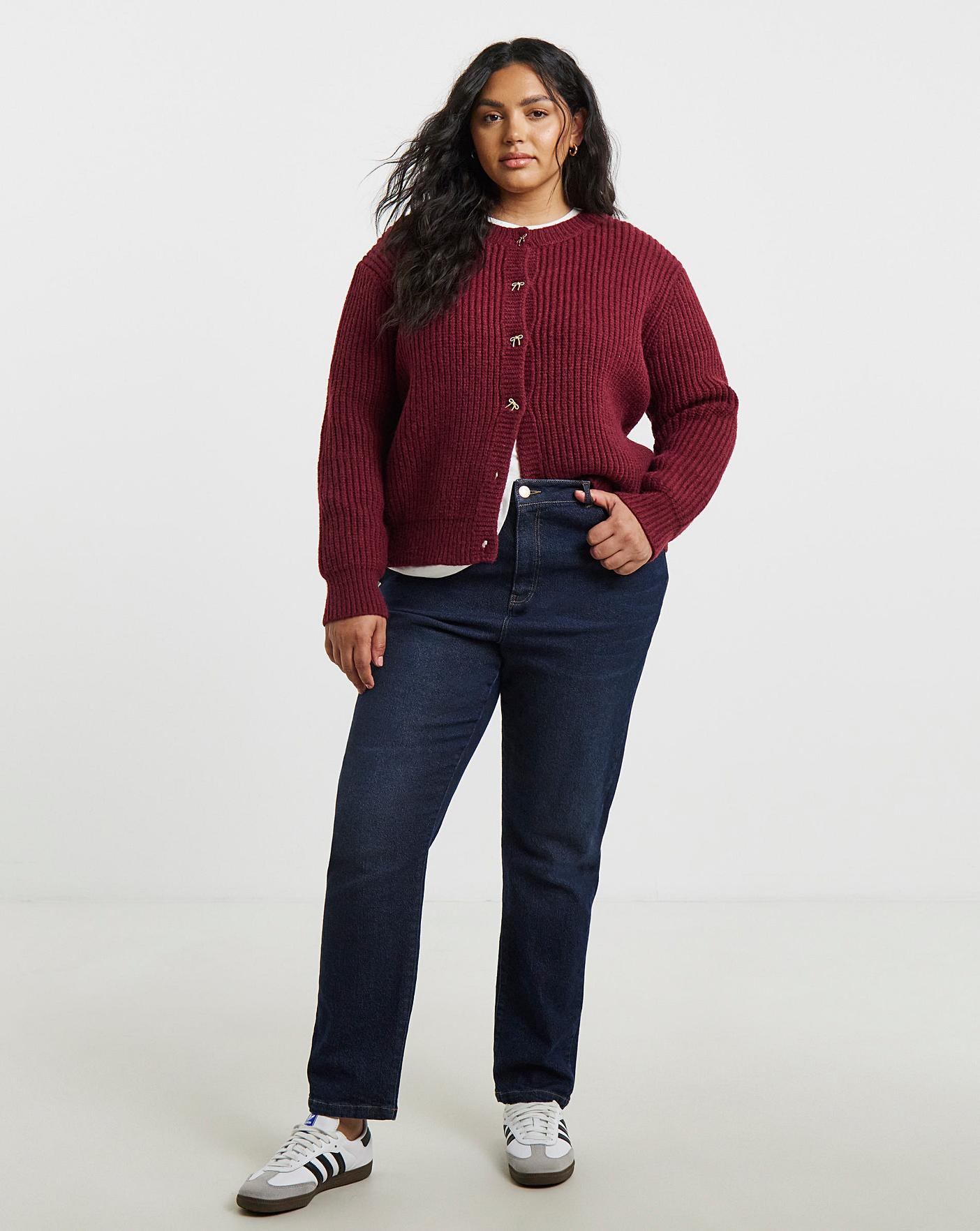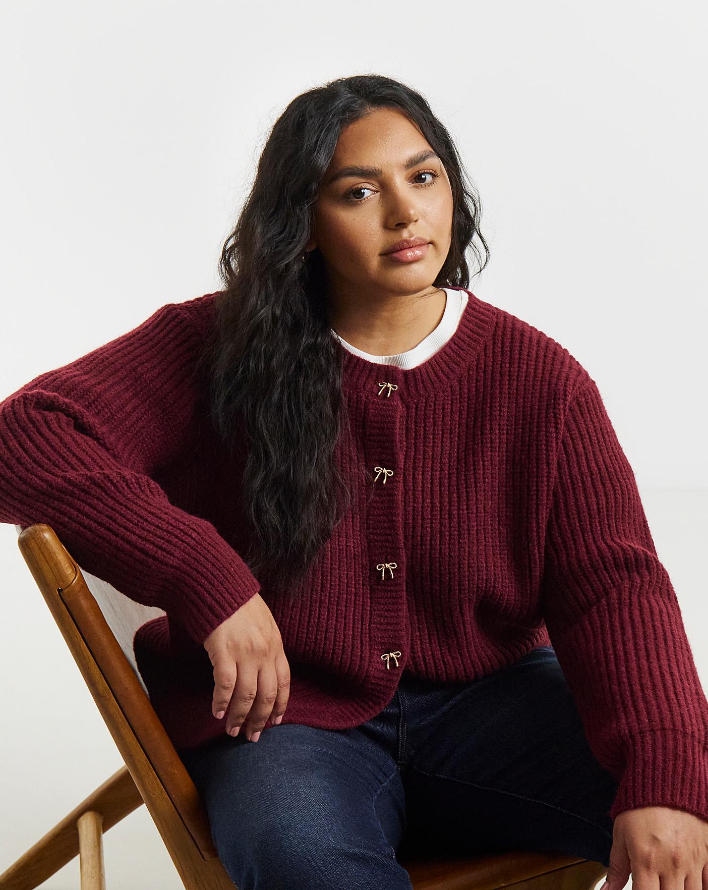 Its luxurious texture blends charm and comfort. Featuring a classic round neckline, this burgundy cardigan is adorned with delicate gold bow buttons for a feminine touch. Style with a mini skirt and knee-high boots for a modern, elegant look.