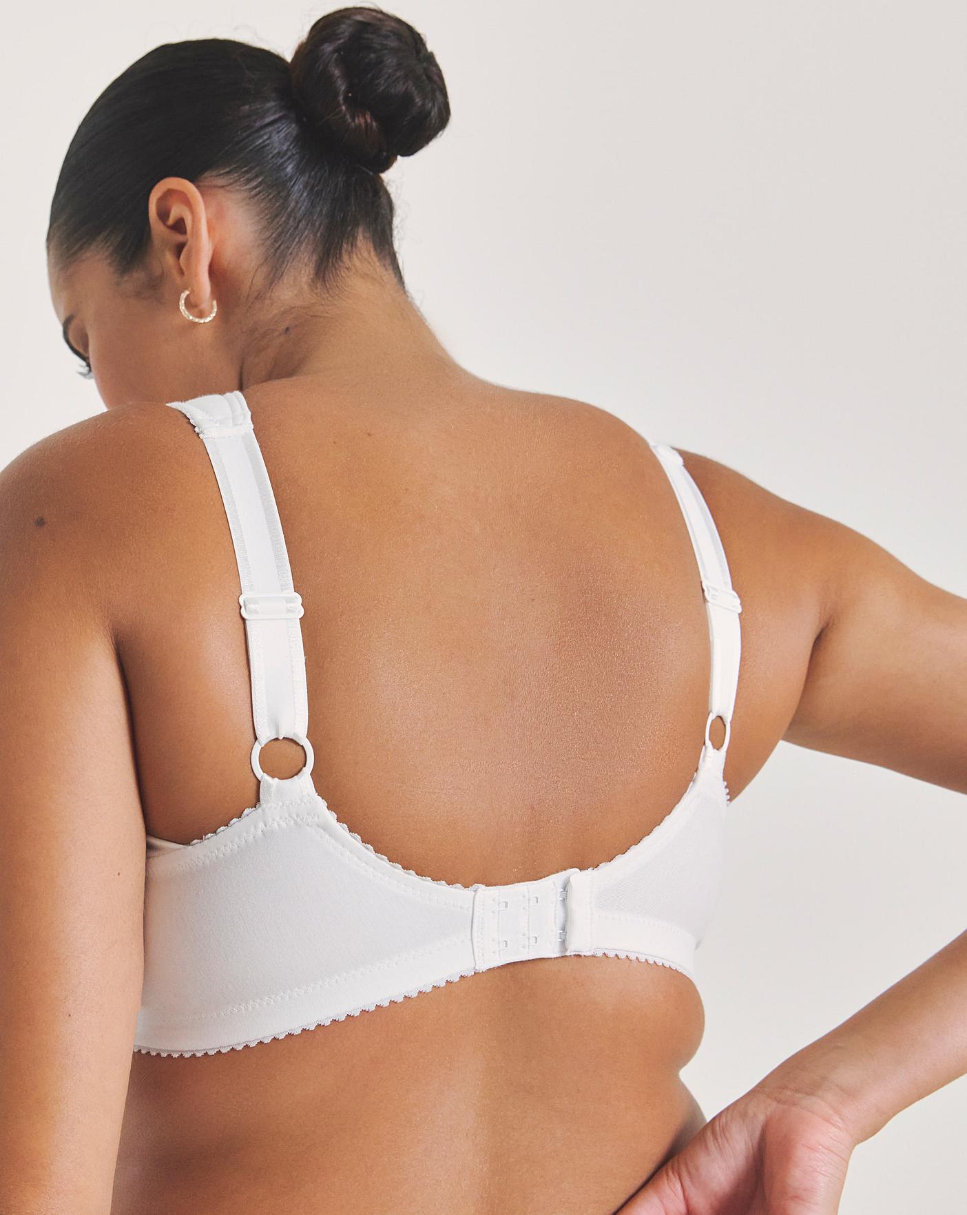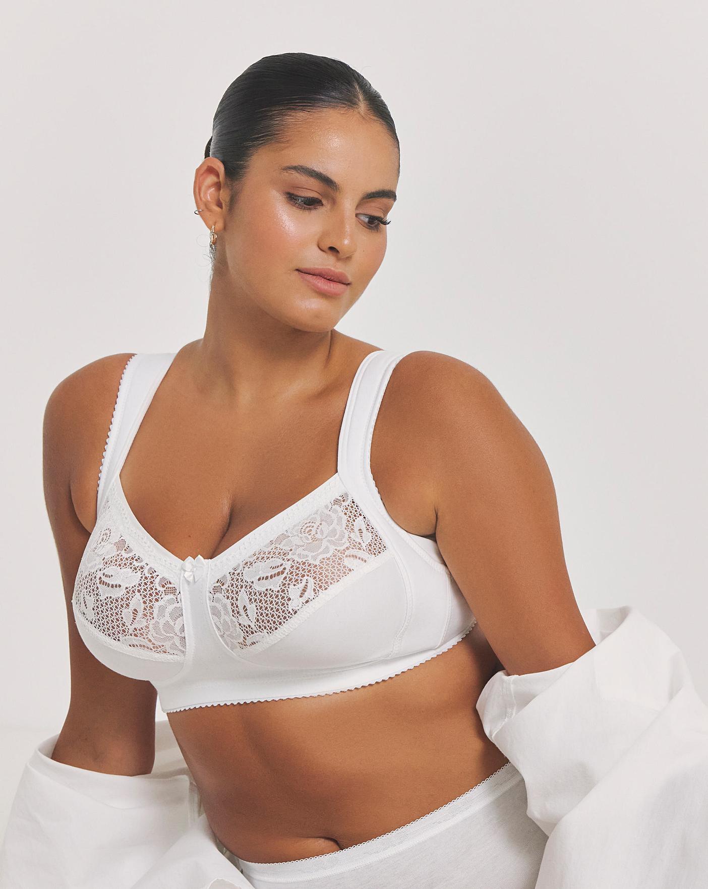 Comfortable soft-cup bra in soft Cotton. Cup in rigid Cotton with beautiful, elastic lace decor and a very soft, comfortable, folded edge at the top. Support wings at the armhole increase the comfort and smooth the “muffin effect”. Padded side support and wide padded comfort straps, back adjustable. Back in comfortable elastic material with hook & eye fastening.