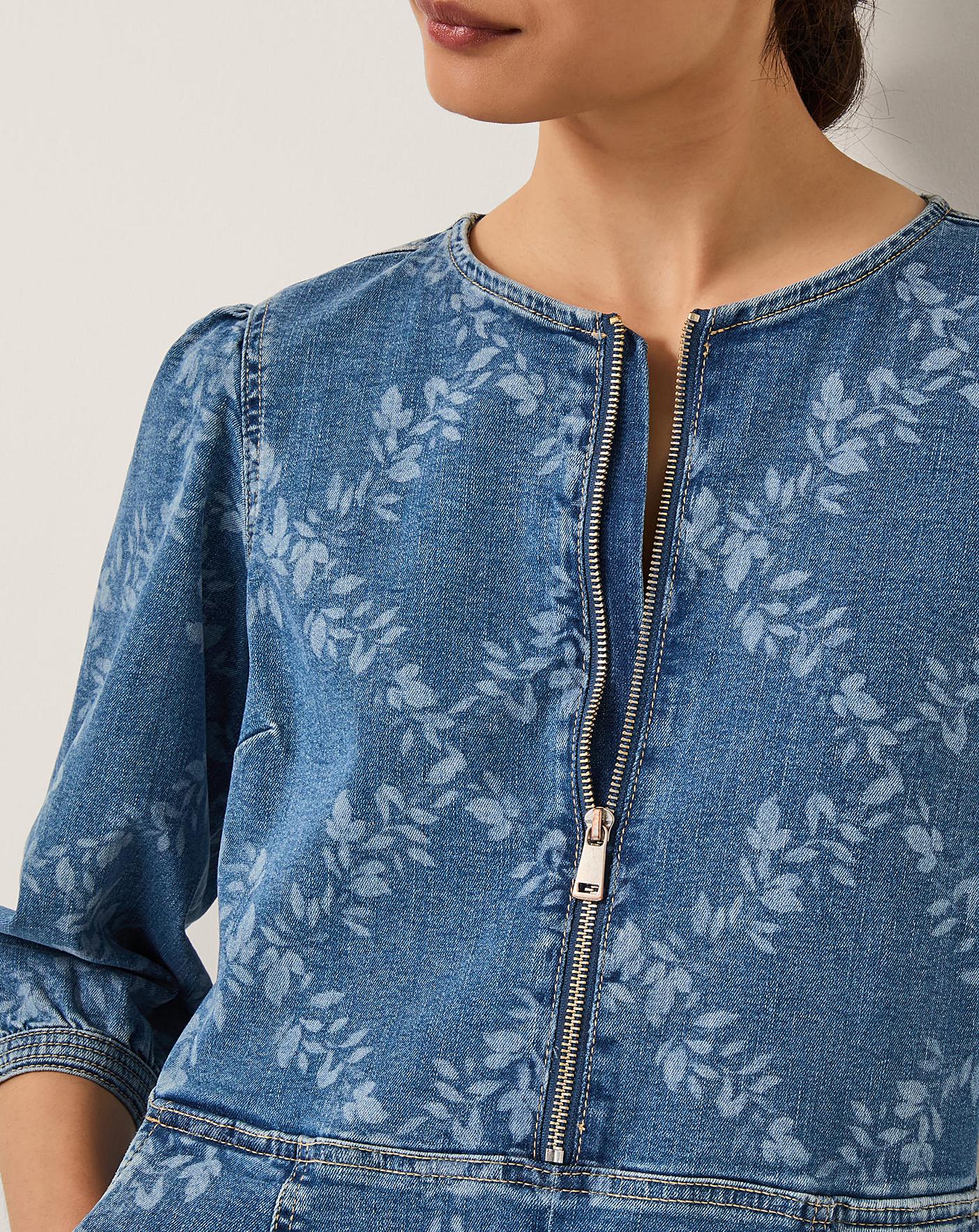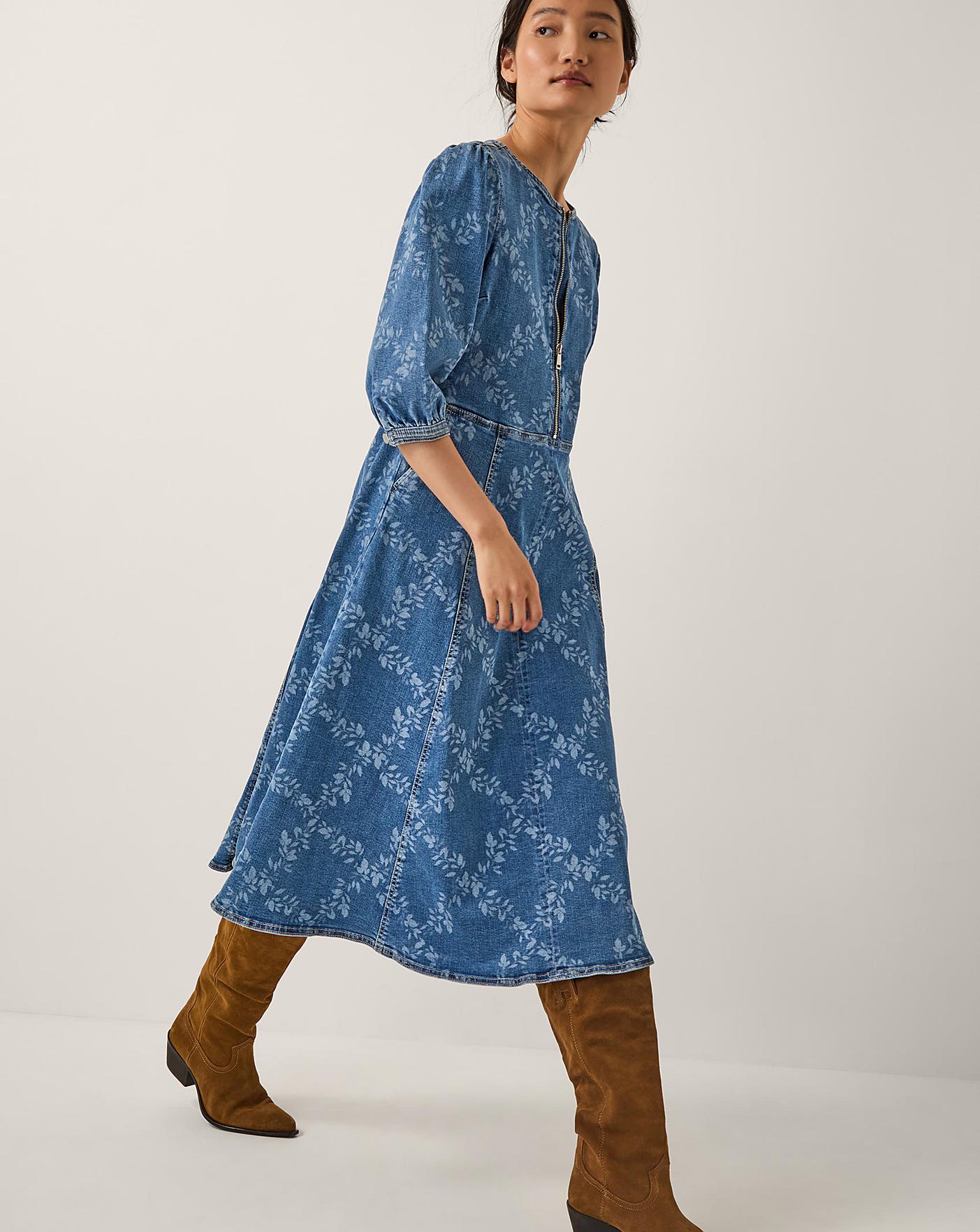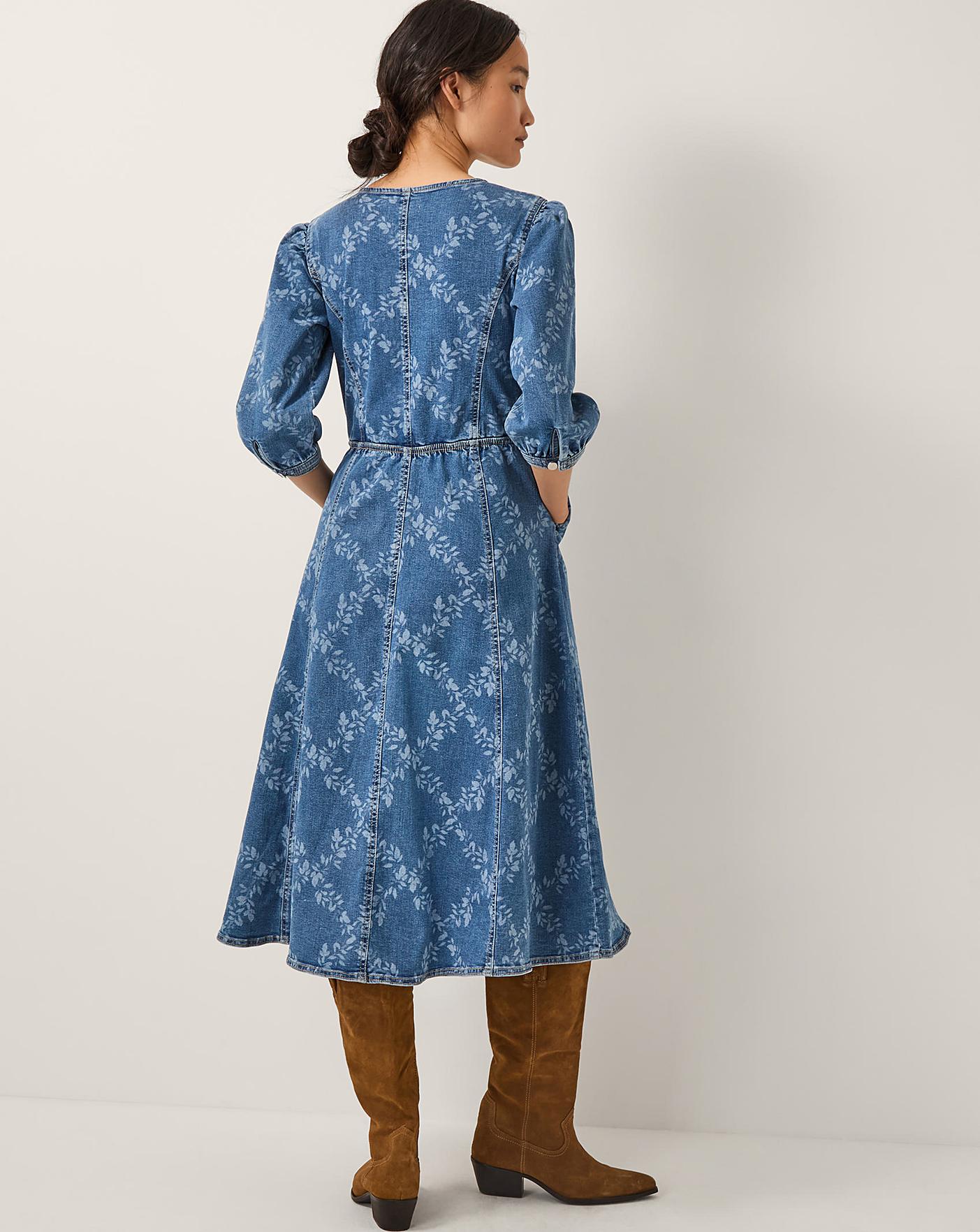 May cause compliments. A versatile addition to your transitional staples, this dress pairs perfectly with all the footwear in your shoe-drobe. Designed in blue wash denim, the floral patterns add a feminine touch, whilst the fit-and-flare silhouette creates a statement with every stride.