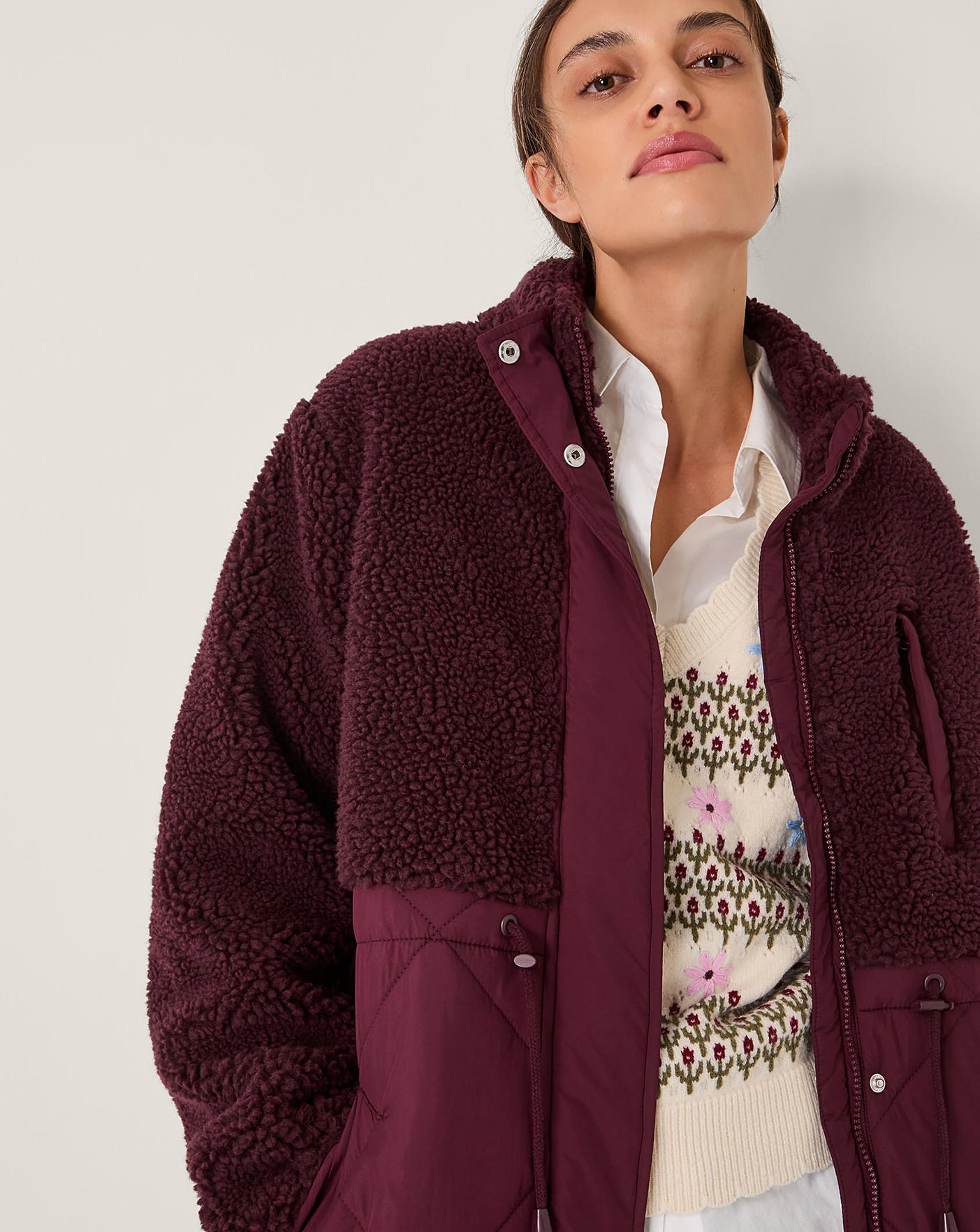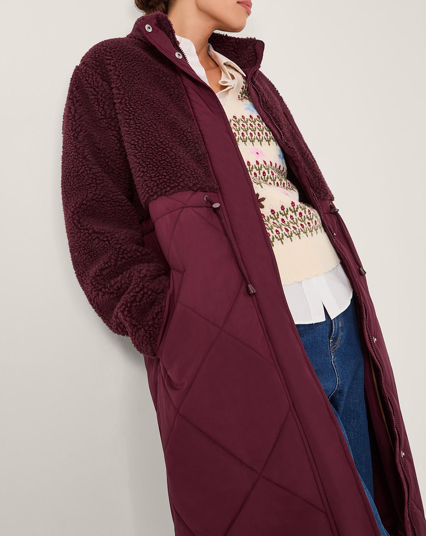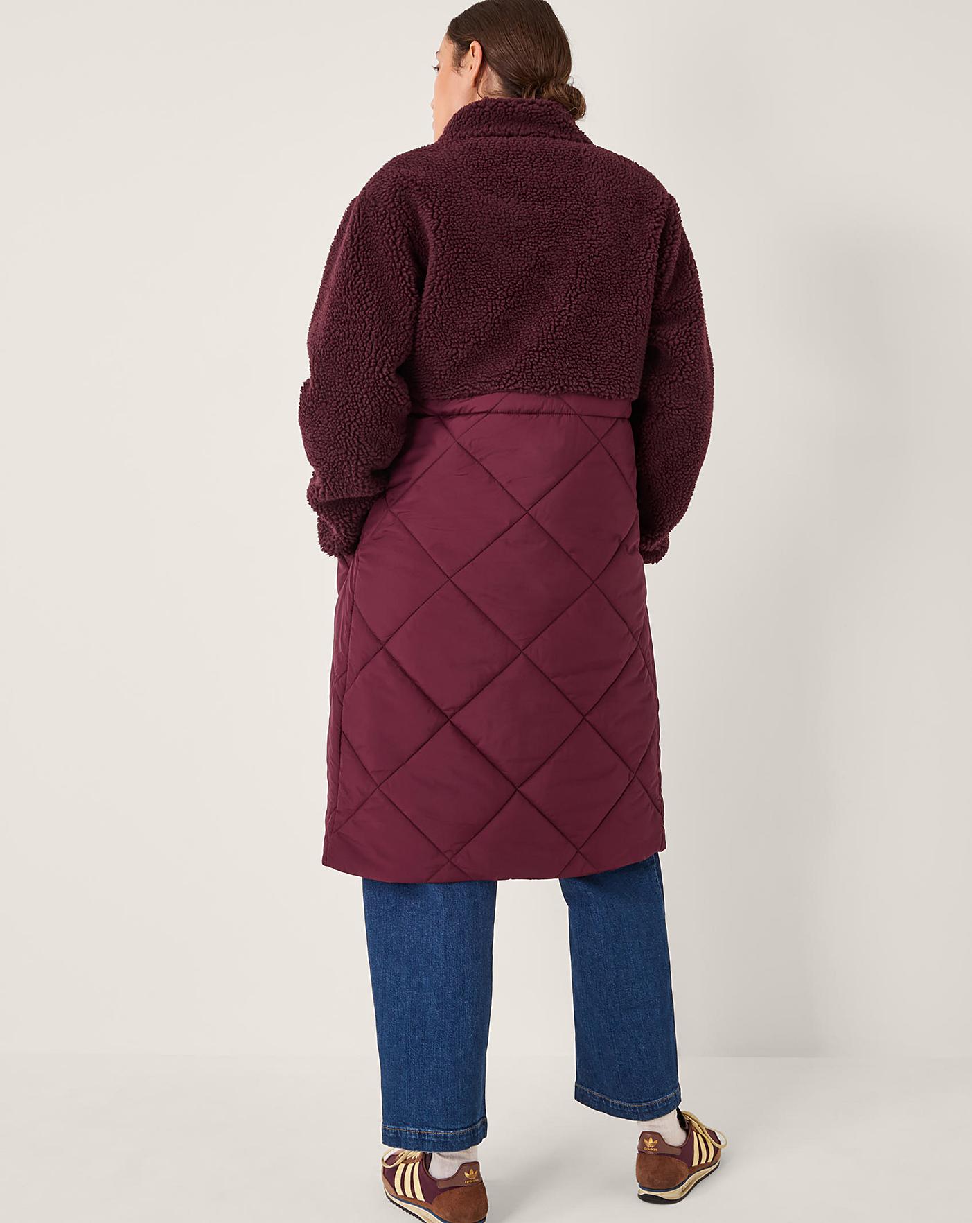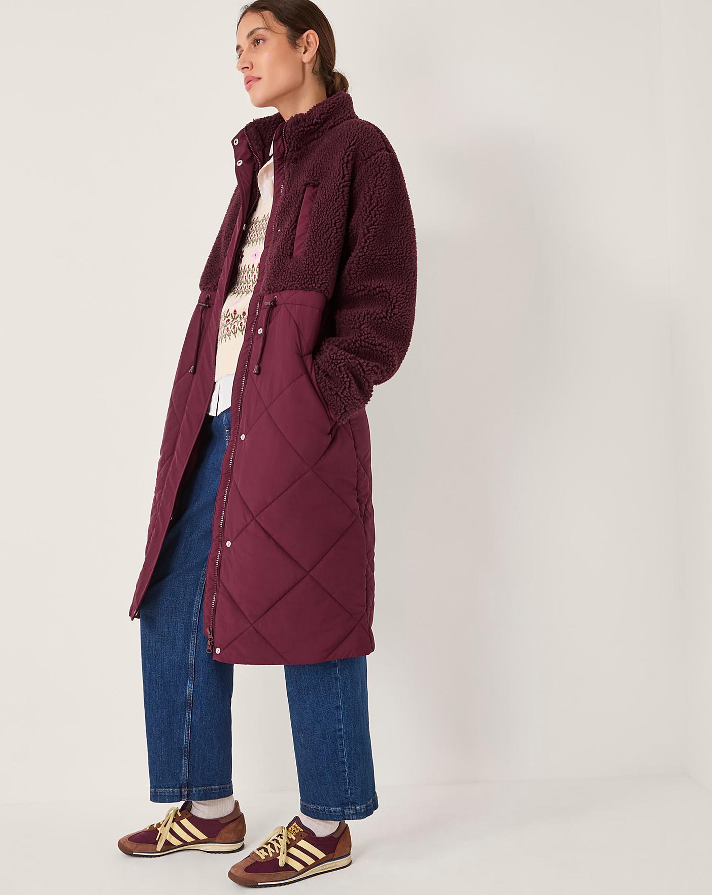Your new go-to for chilly days and stylish moments. Designed in the colour of the season, this quilted coat features cosy borg accents on the bodice and sleeves. Finished with side pockets and a discreet zip fastening.