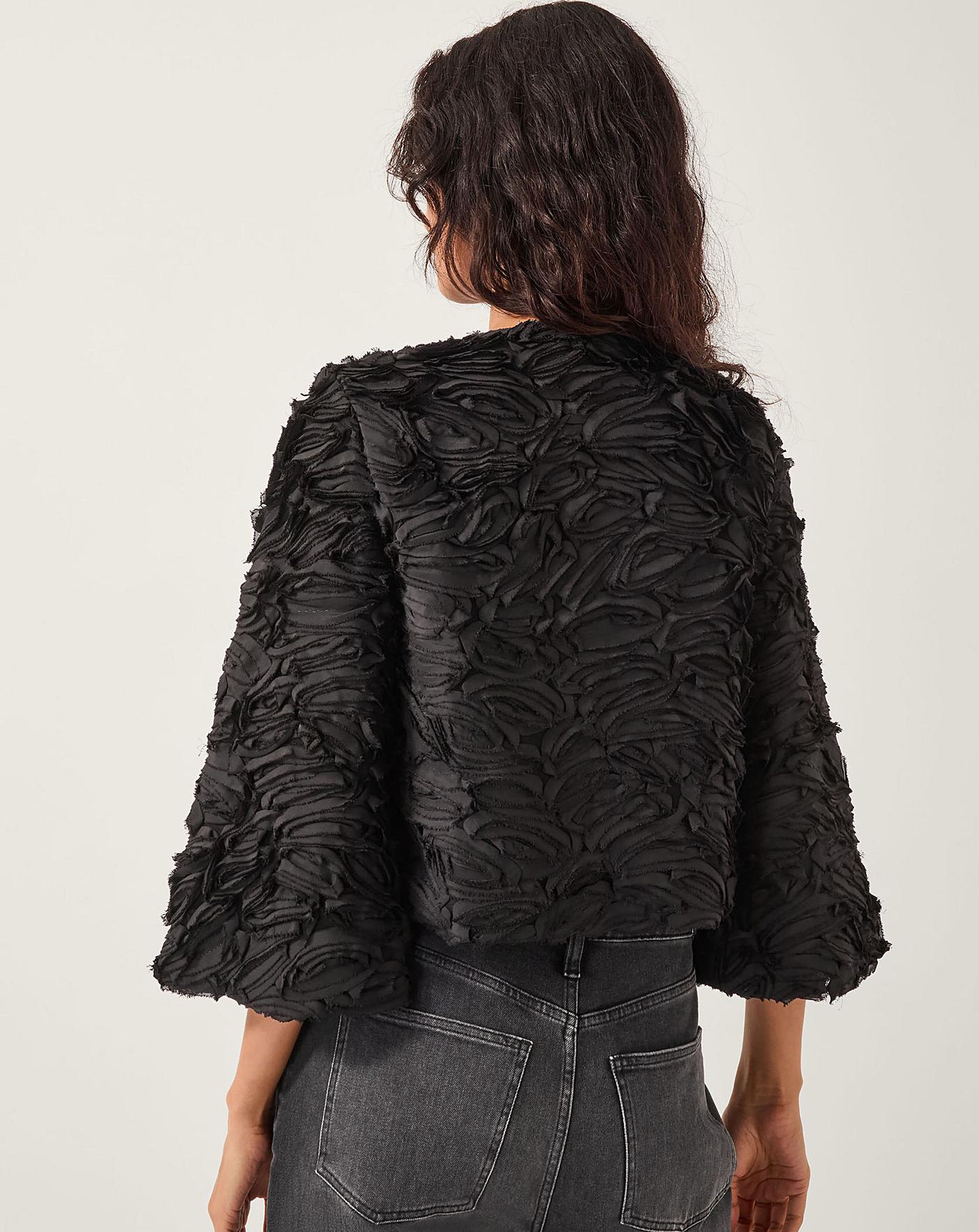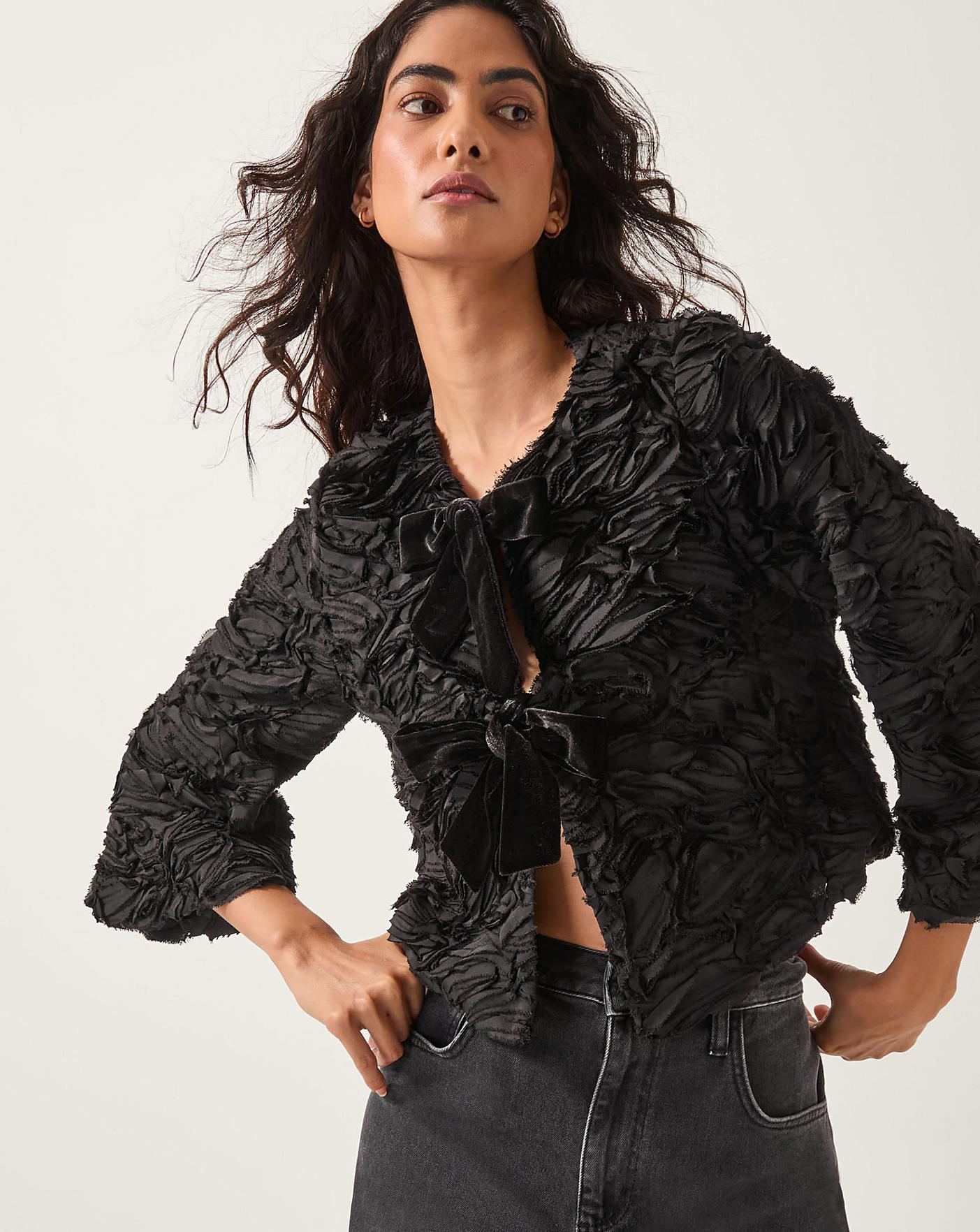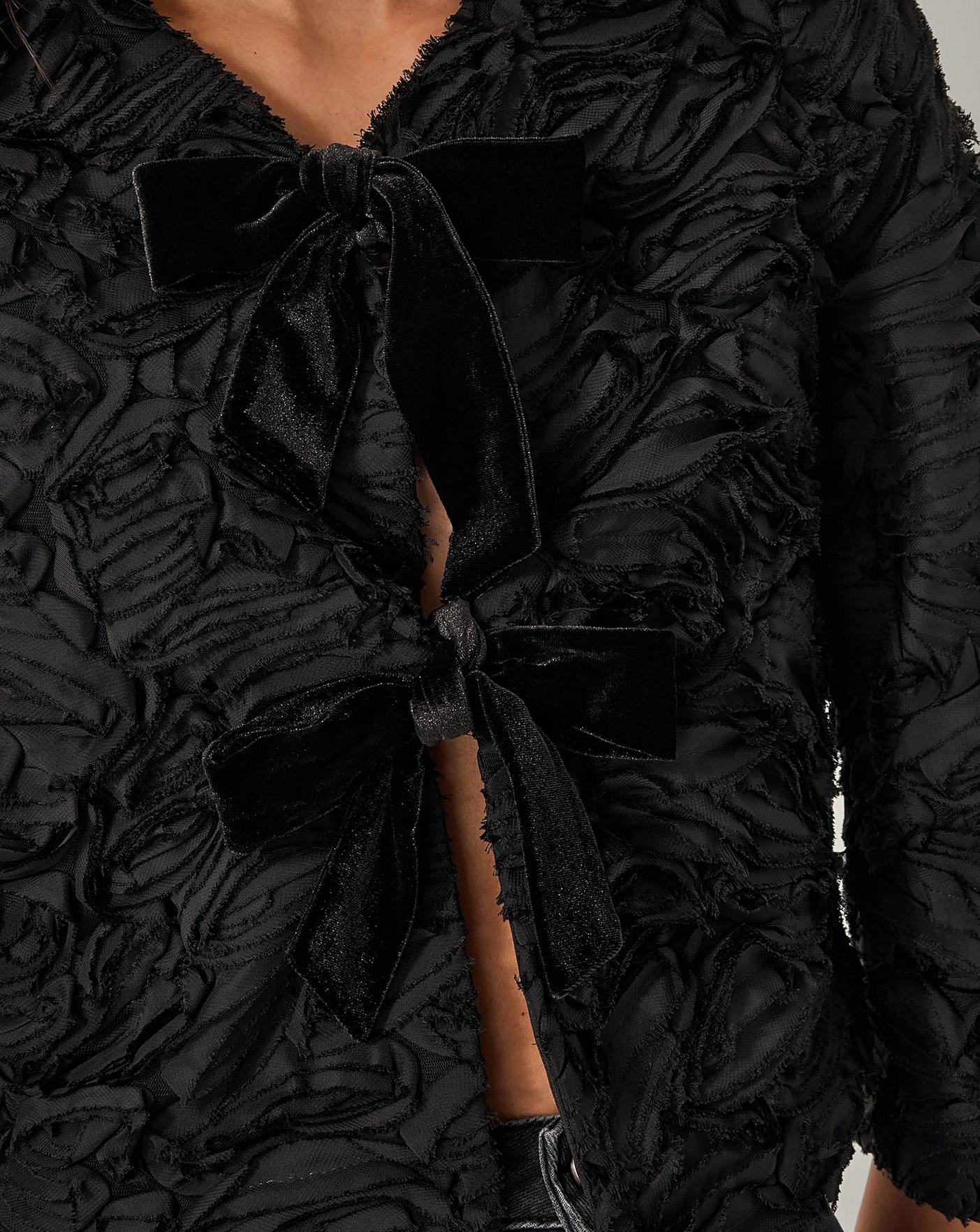Take a bow. Quite literally gift wrapped, this statement jacket takes any outfit to the next level. Designed in a texture reminiscent of a rose bouquet, it fastens with velvet bows through the front for a party-primed finish.