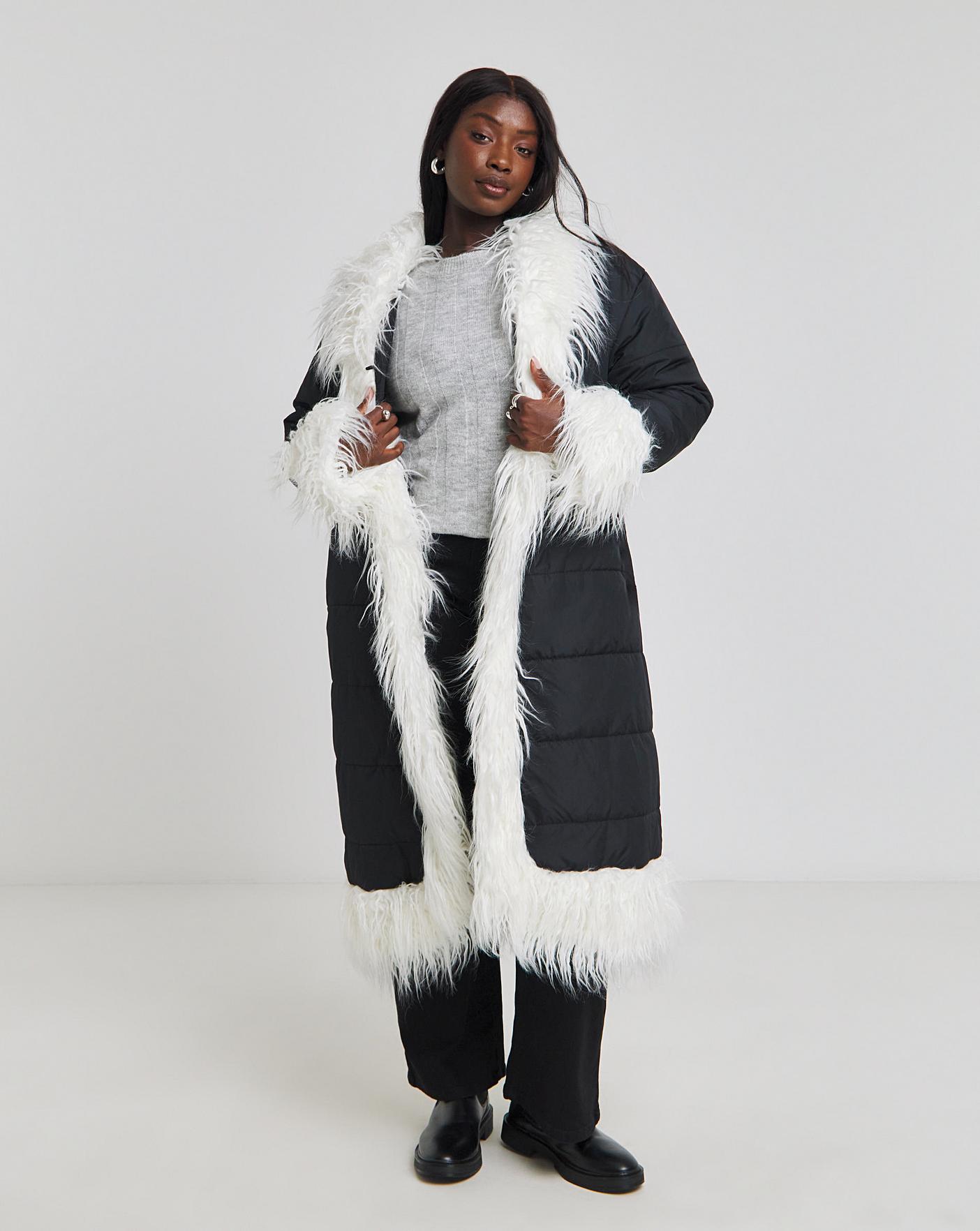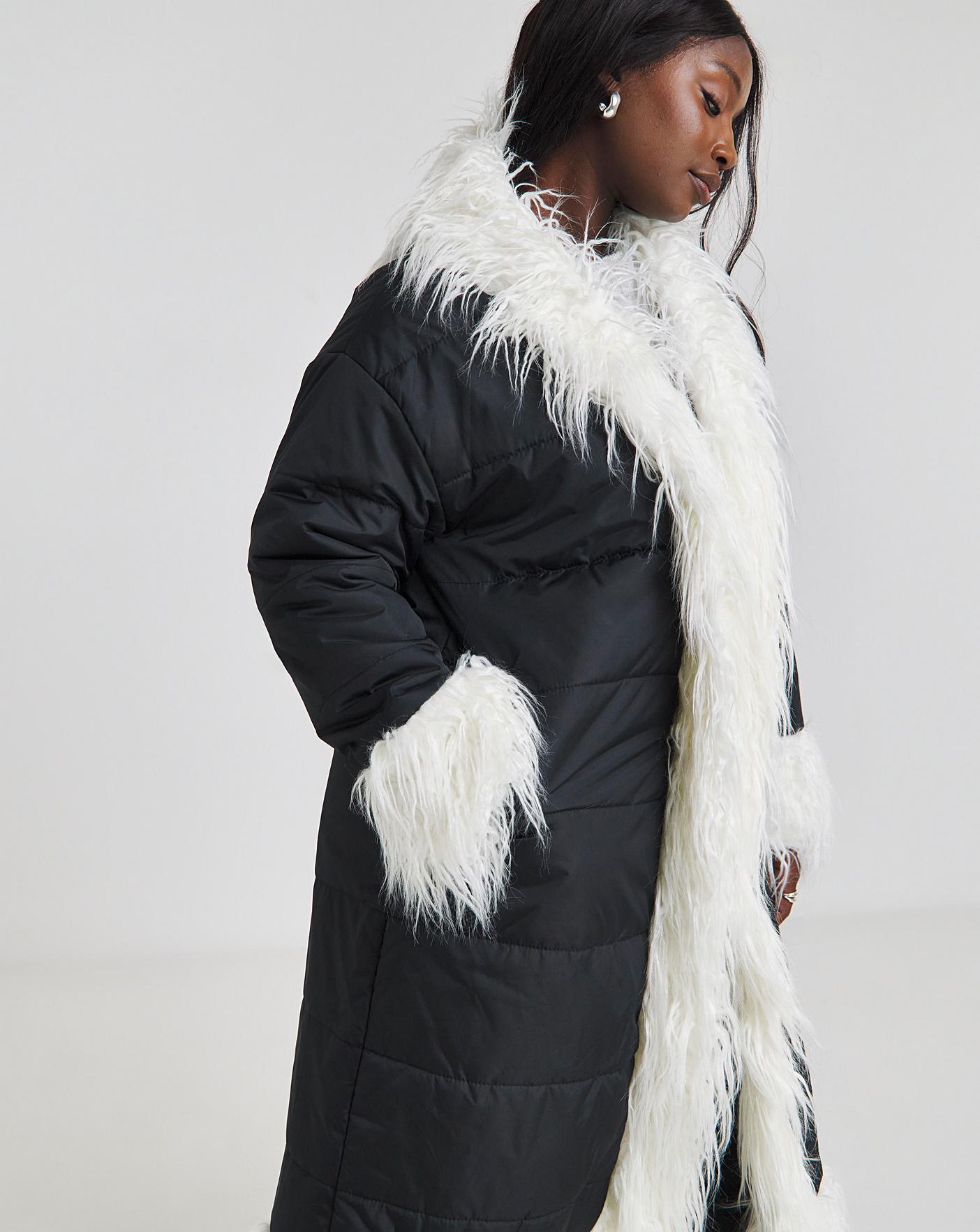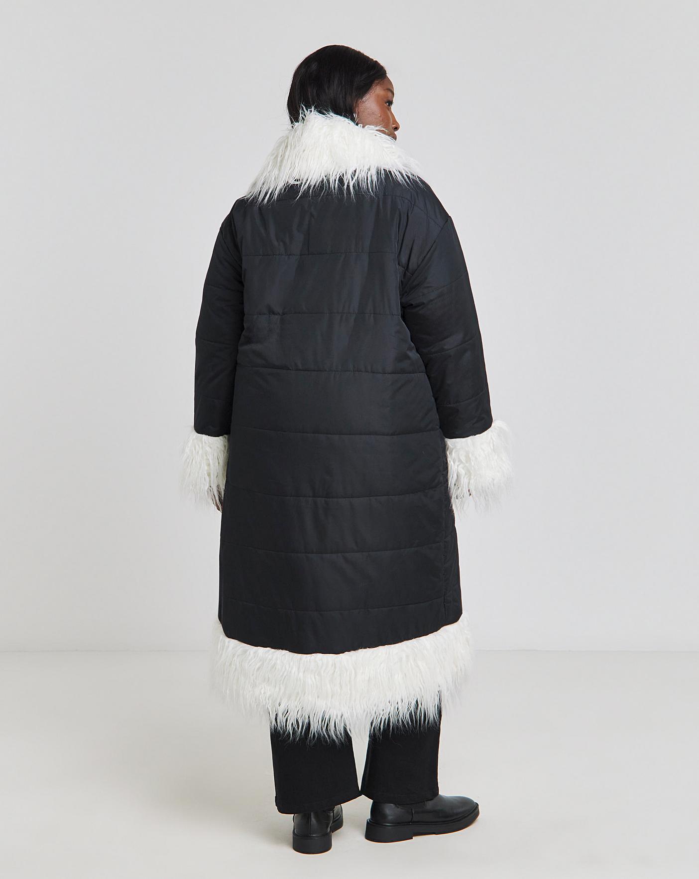 Native Youth quilted padded coat longline faux shaggy fur coat in timeless black, adorned with a contrast white fur trim. Make a statement with this longline coat, carefully crafted to elevate your winter wardrobe. The shaggy faux fur adds an element of chic texture, while the contrasting trim sets you apart in the world of fashion.