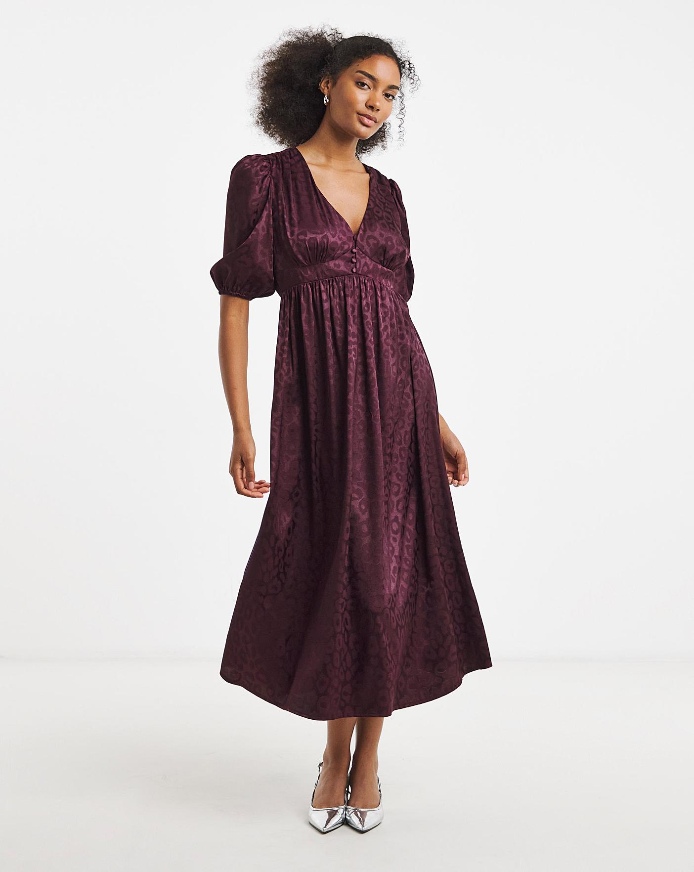 A great addition to your wardrobe this season. Shop this stylish dress featuring: plum colour, v neckline, midi length, satin, jacquard fabric, flattering fit, exaggerated sleeves. Simply pair with heels for a gorgeous going out look.