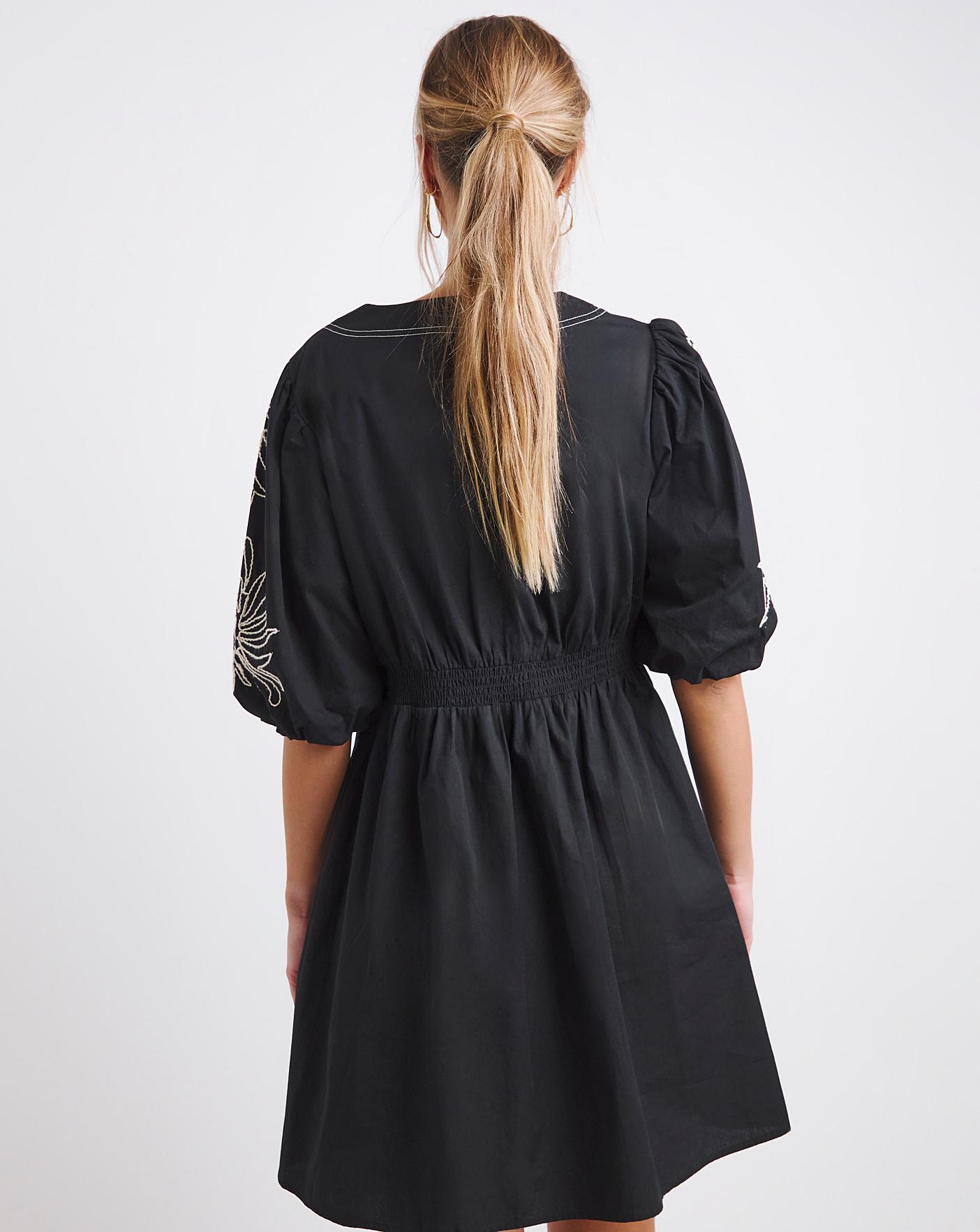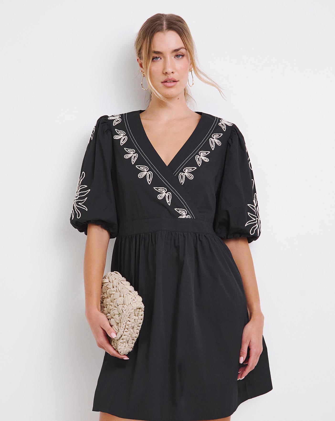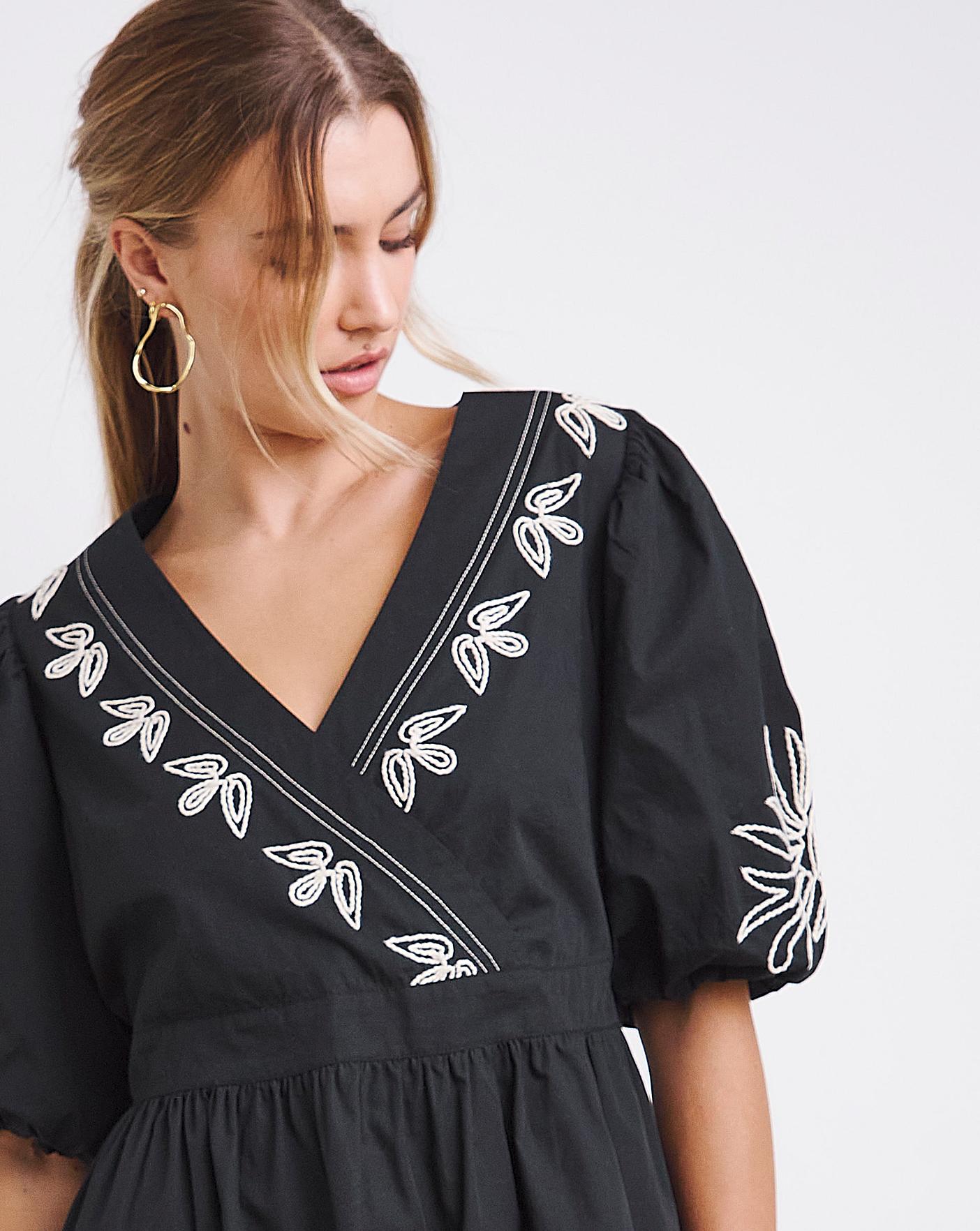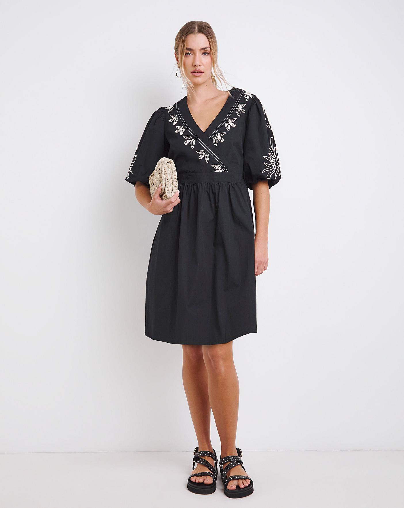 Shop this poplin wrap dress this season featuring: Wrap front with tie waist. Short voluminous puff sleeves. Delicate embroidered designClassic Black with mono embroidery. This dress is perfect for this time of year.