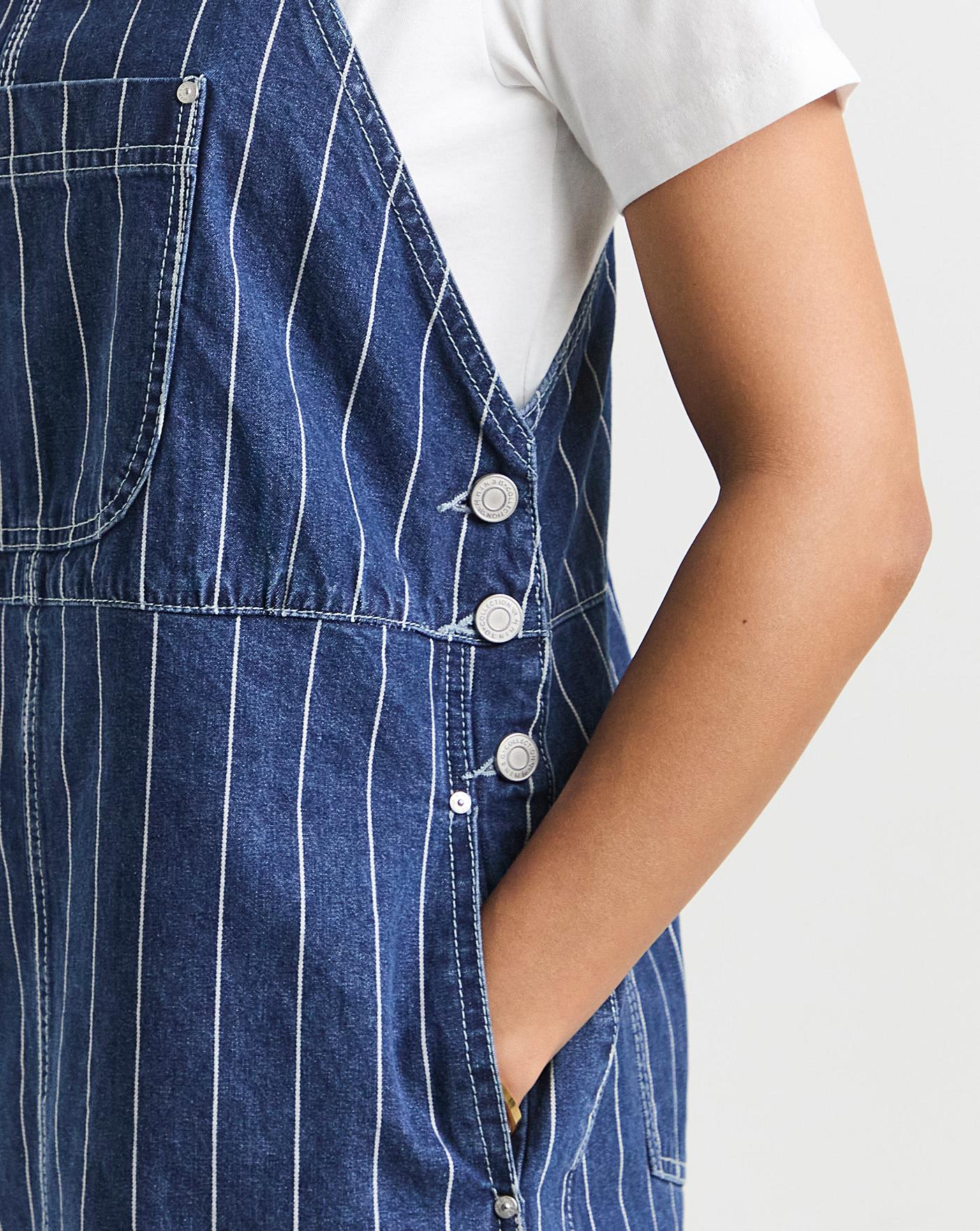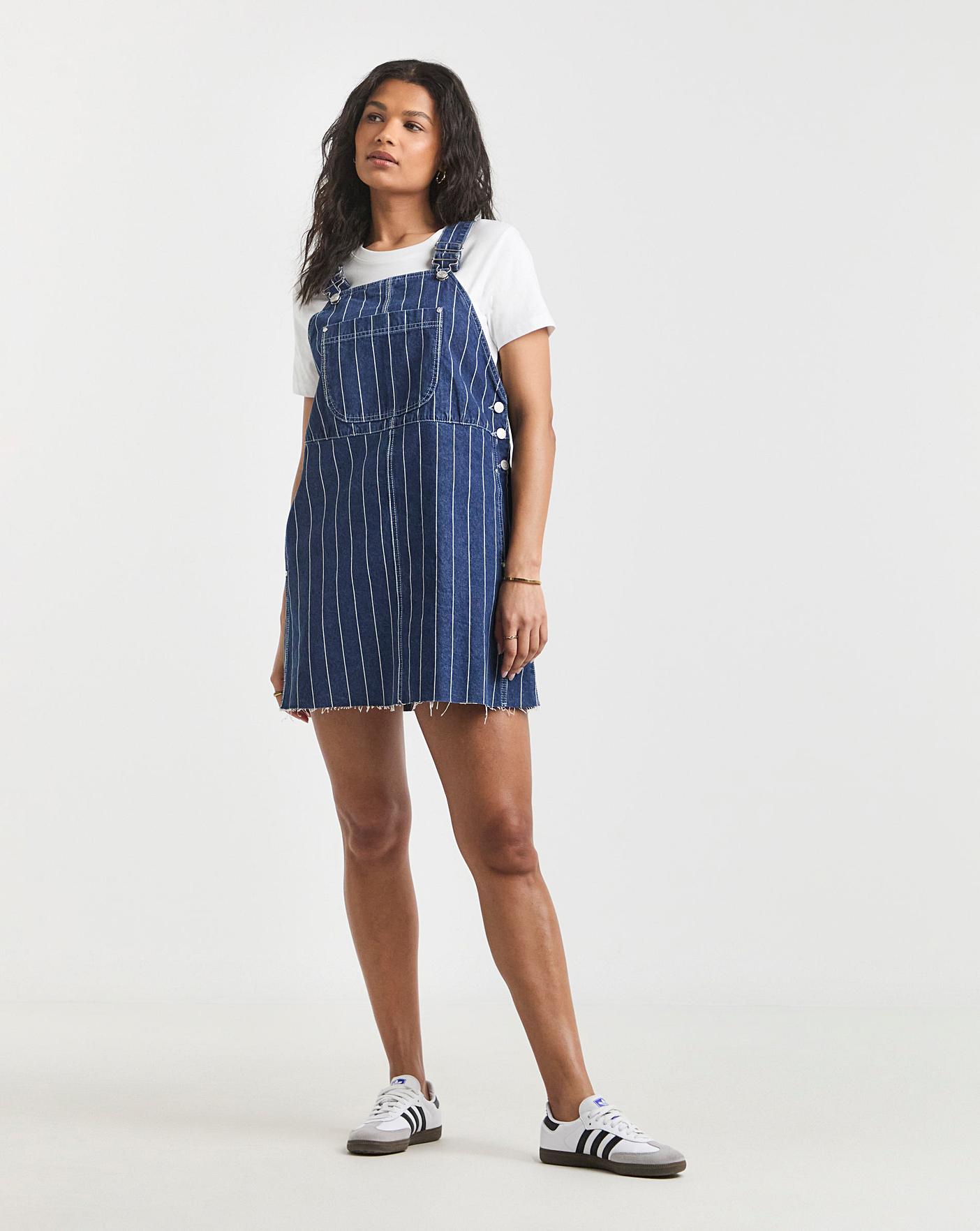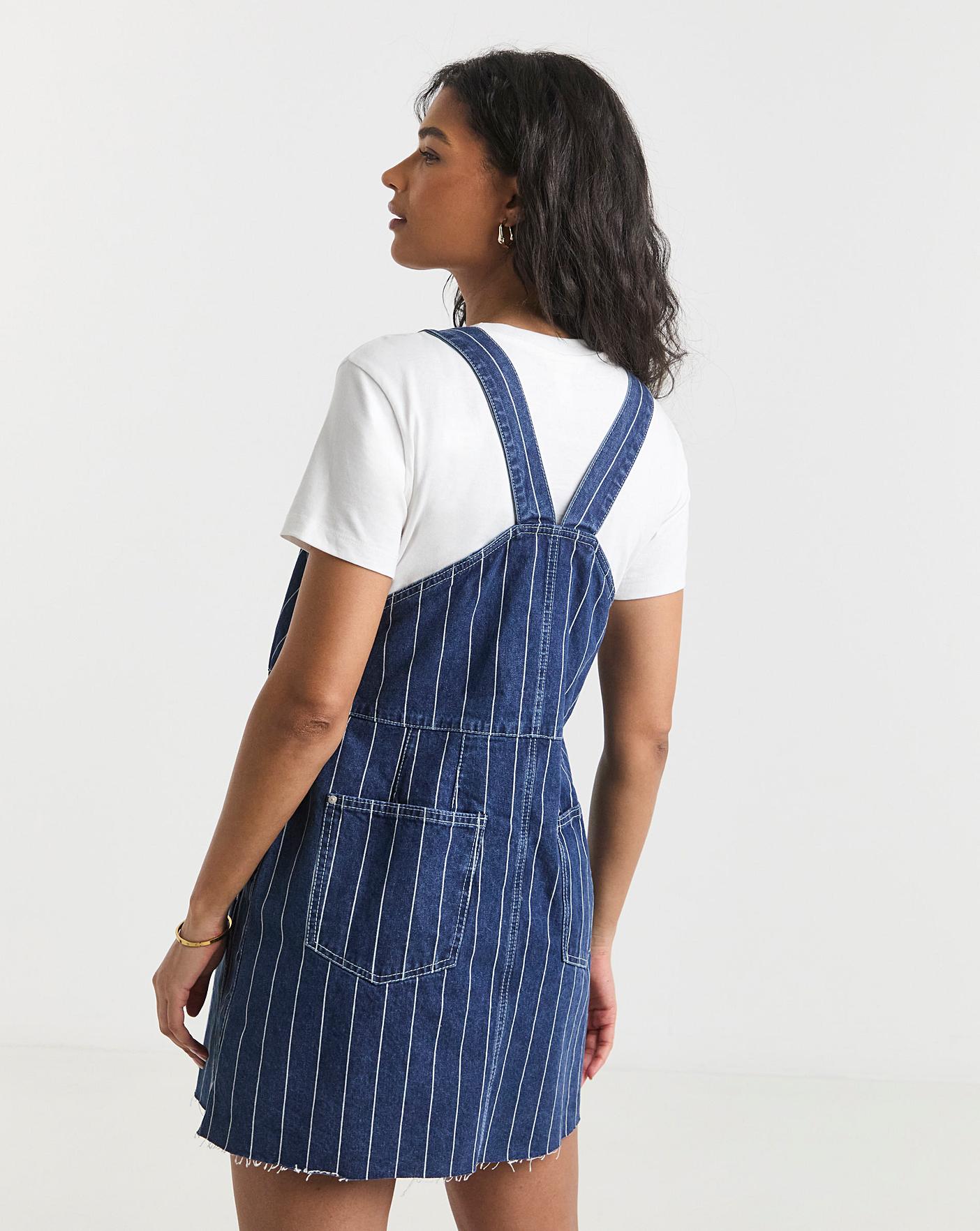Our new Striped Pinafore Dungaree Dress is an ultimate spring staple! It features 3 front pockets, adjustable dungaree straps, authentic silverwear detailing, a gorgeous mini length, and a classic pinstripe on a mid wash denim. Layer with a plain white tee and pair with trainers for a daytime look.
