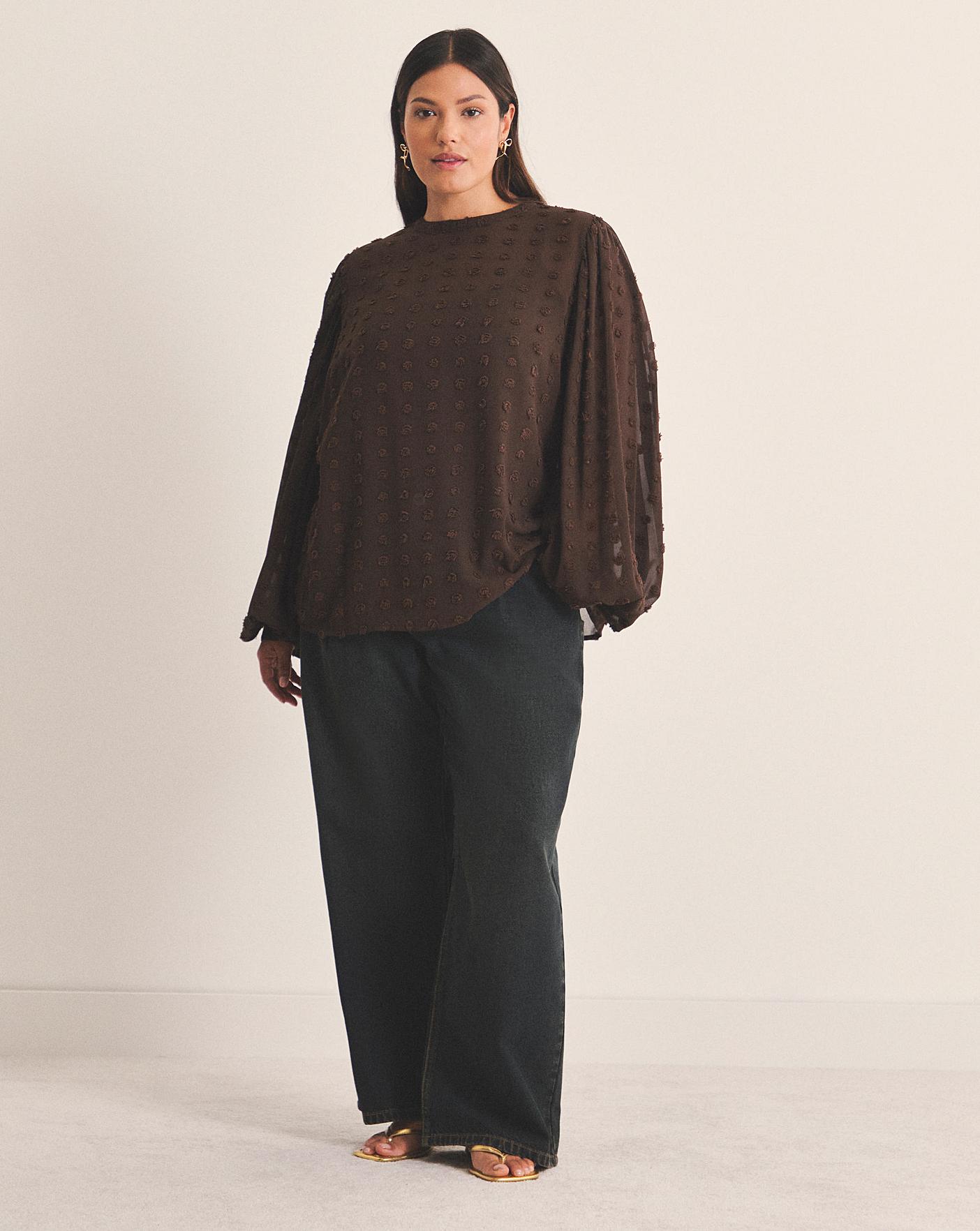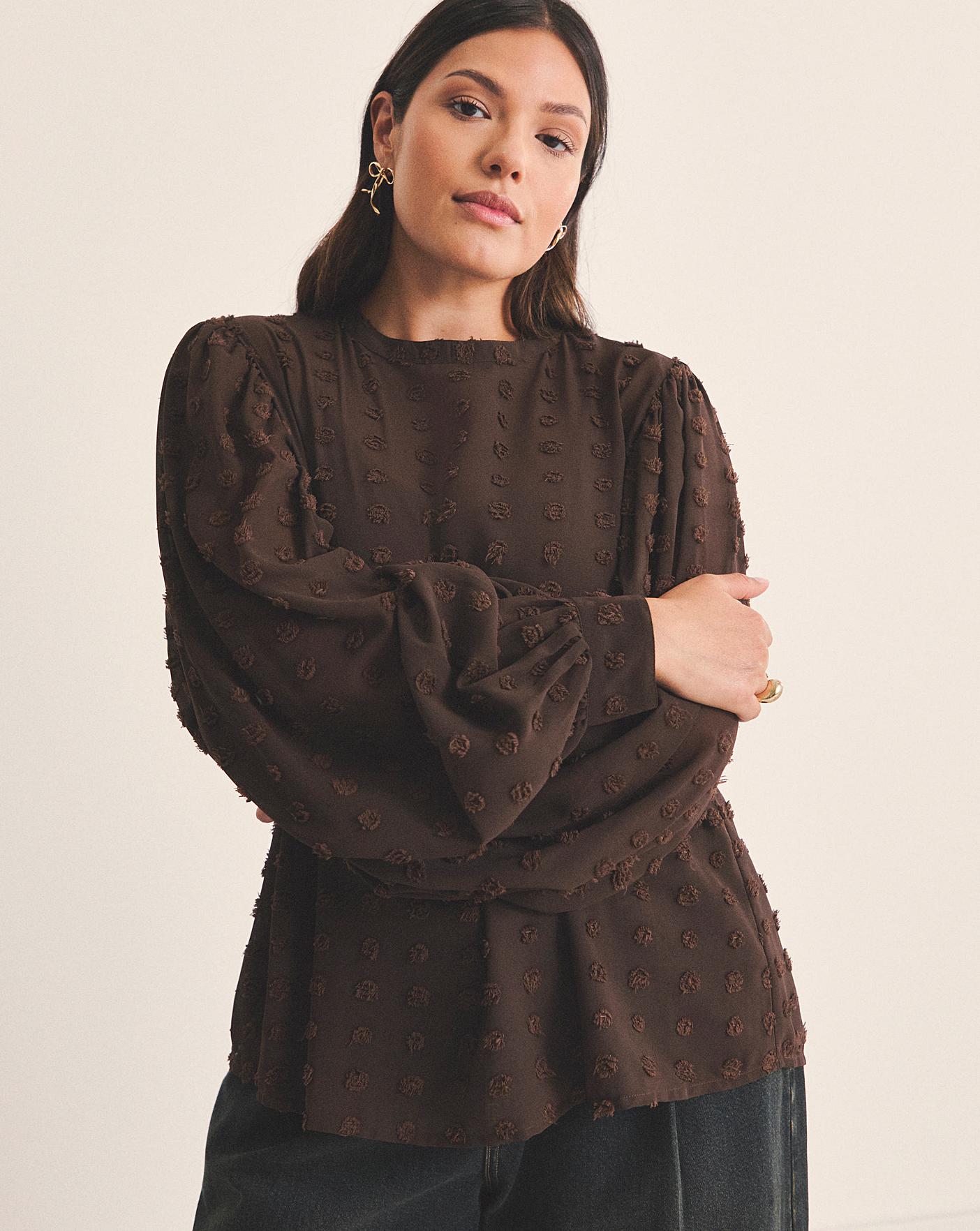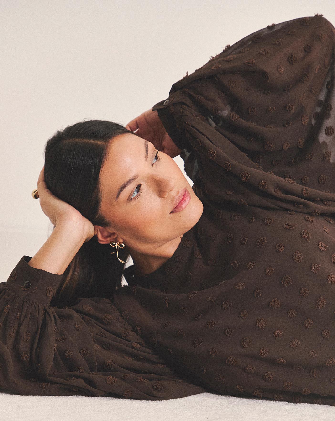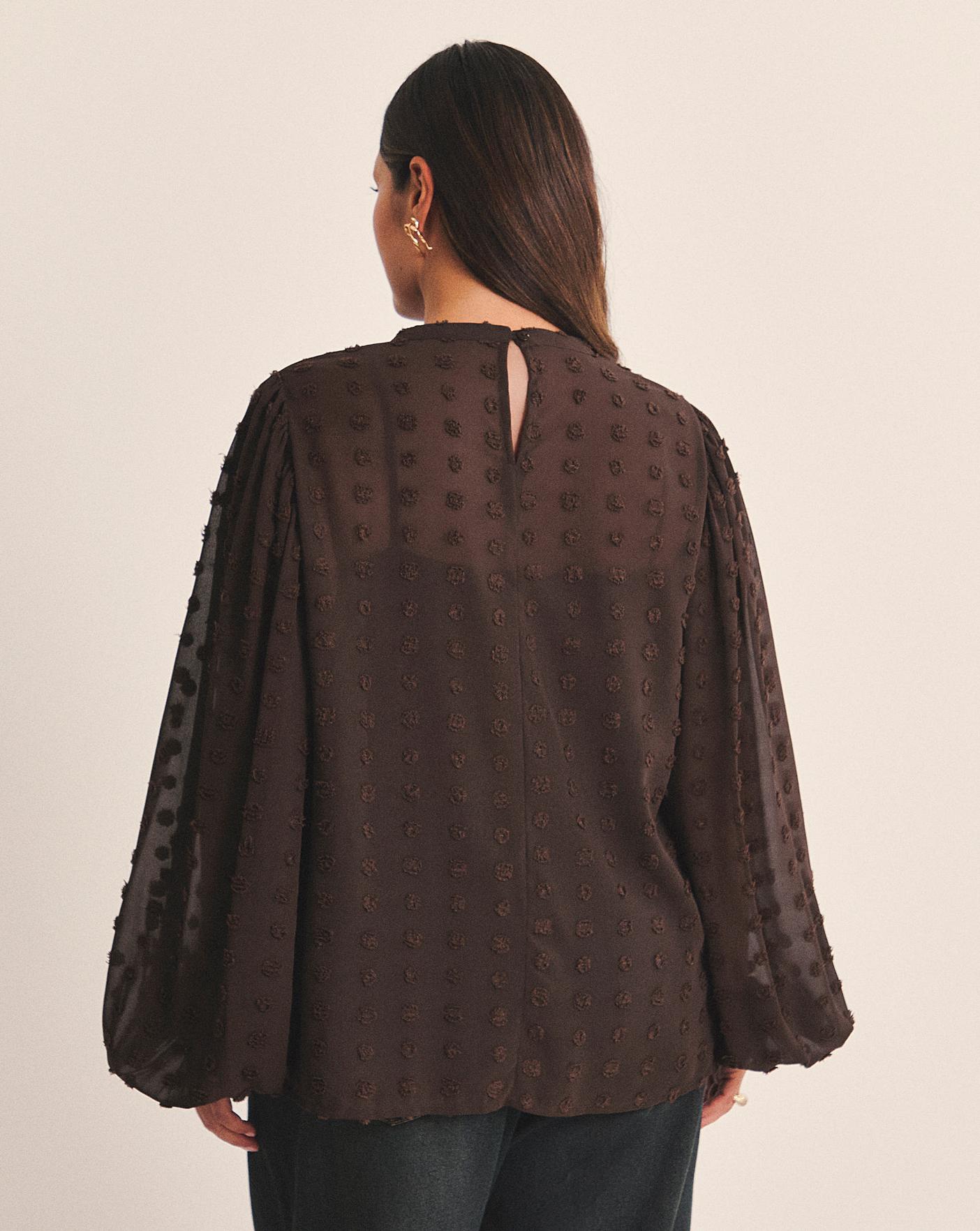 Our well loved dobby is now back in a chocolate brown blouse. Puff sleeve. Round neck. Dobby fabrication. Cuff detailing. Perfect for a day to night look!