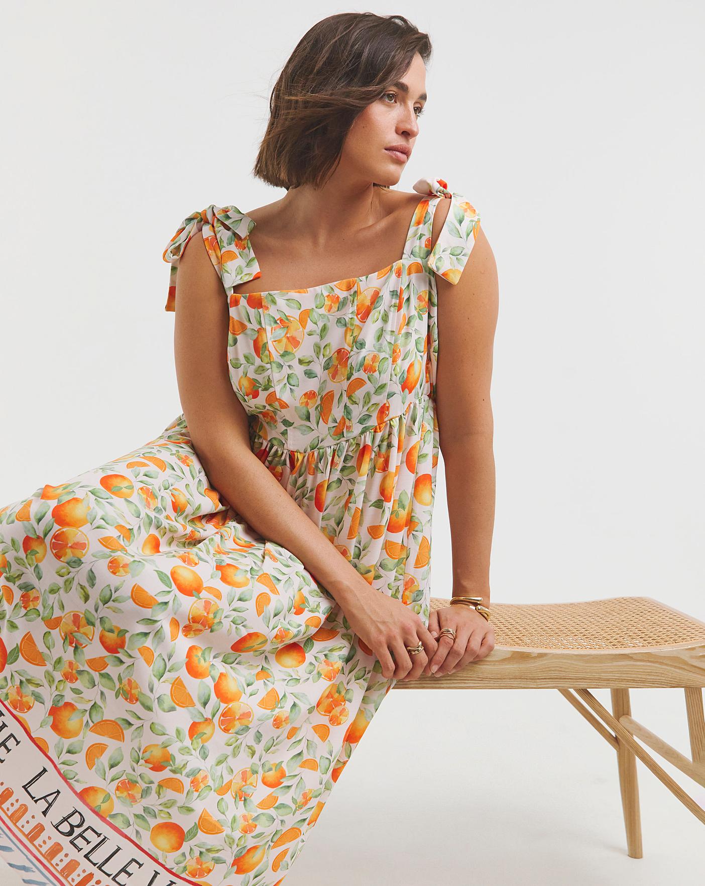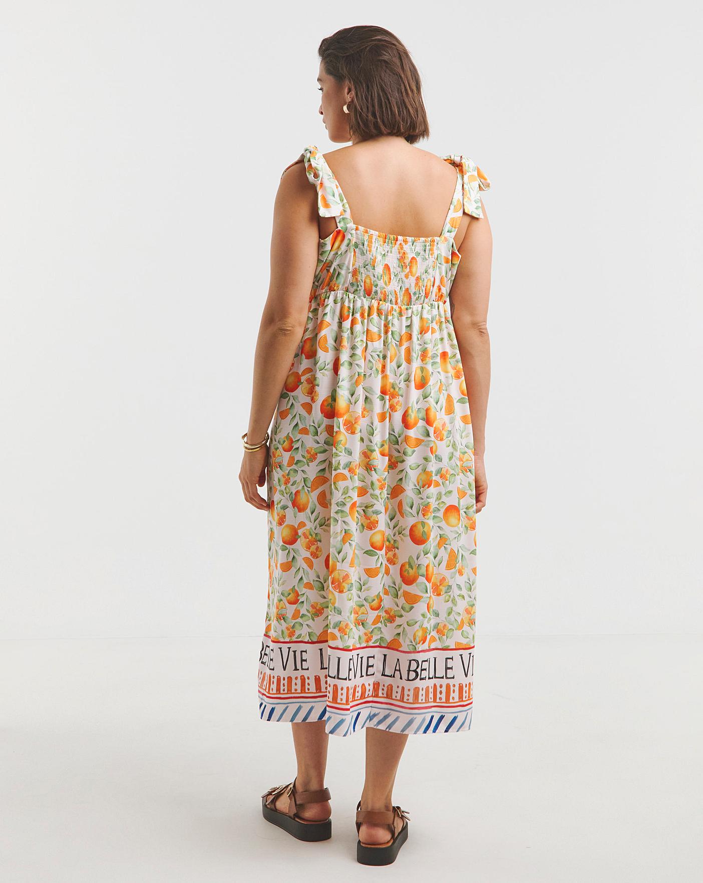 The perfect addition to your everyday wardrobe this season. Shop this super cute dress featuring: Square neckline. Midi length. Tie straps. Fruit print. Simply pair with sandals for an effortless everyday look!