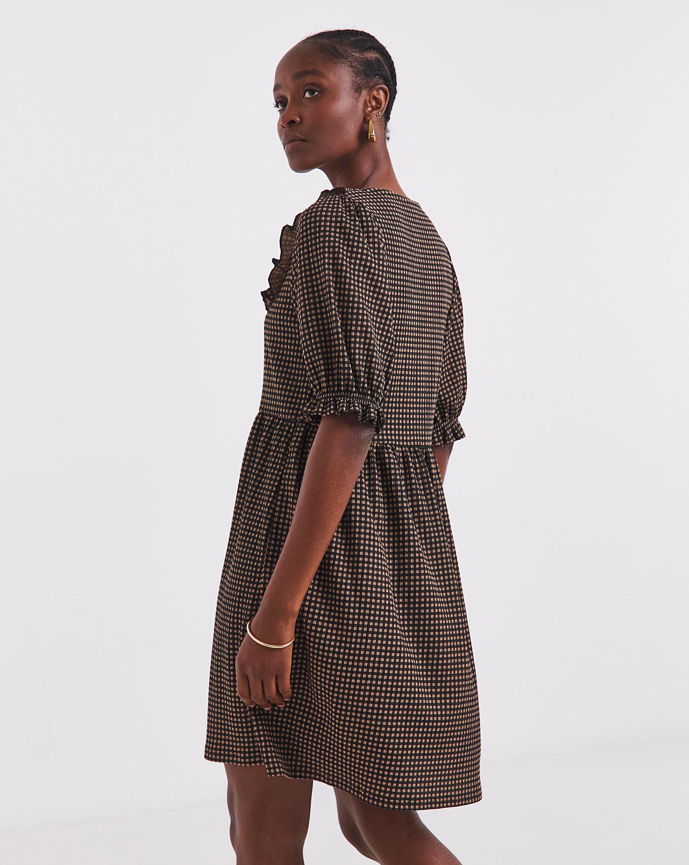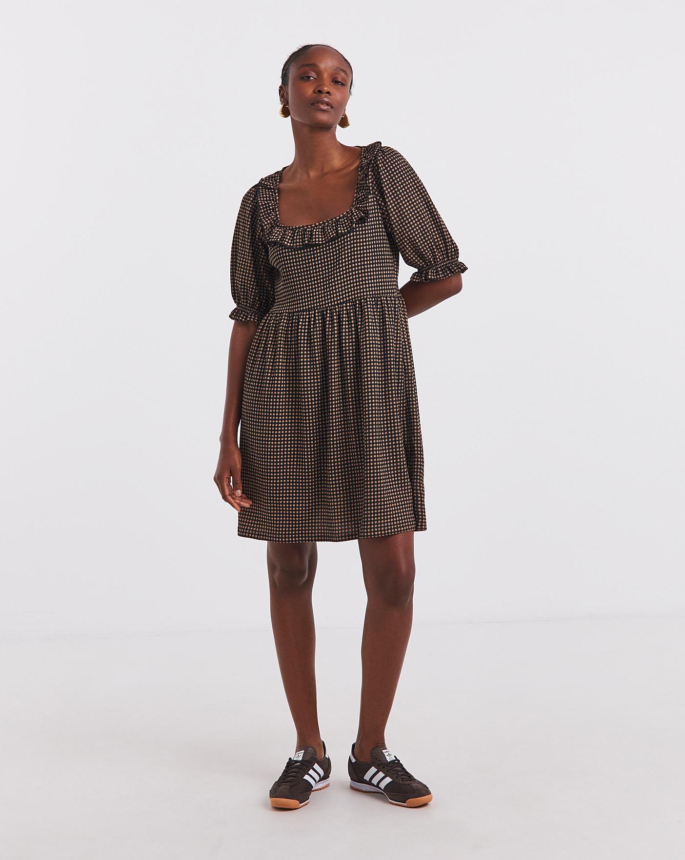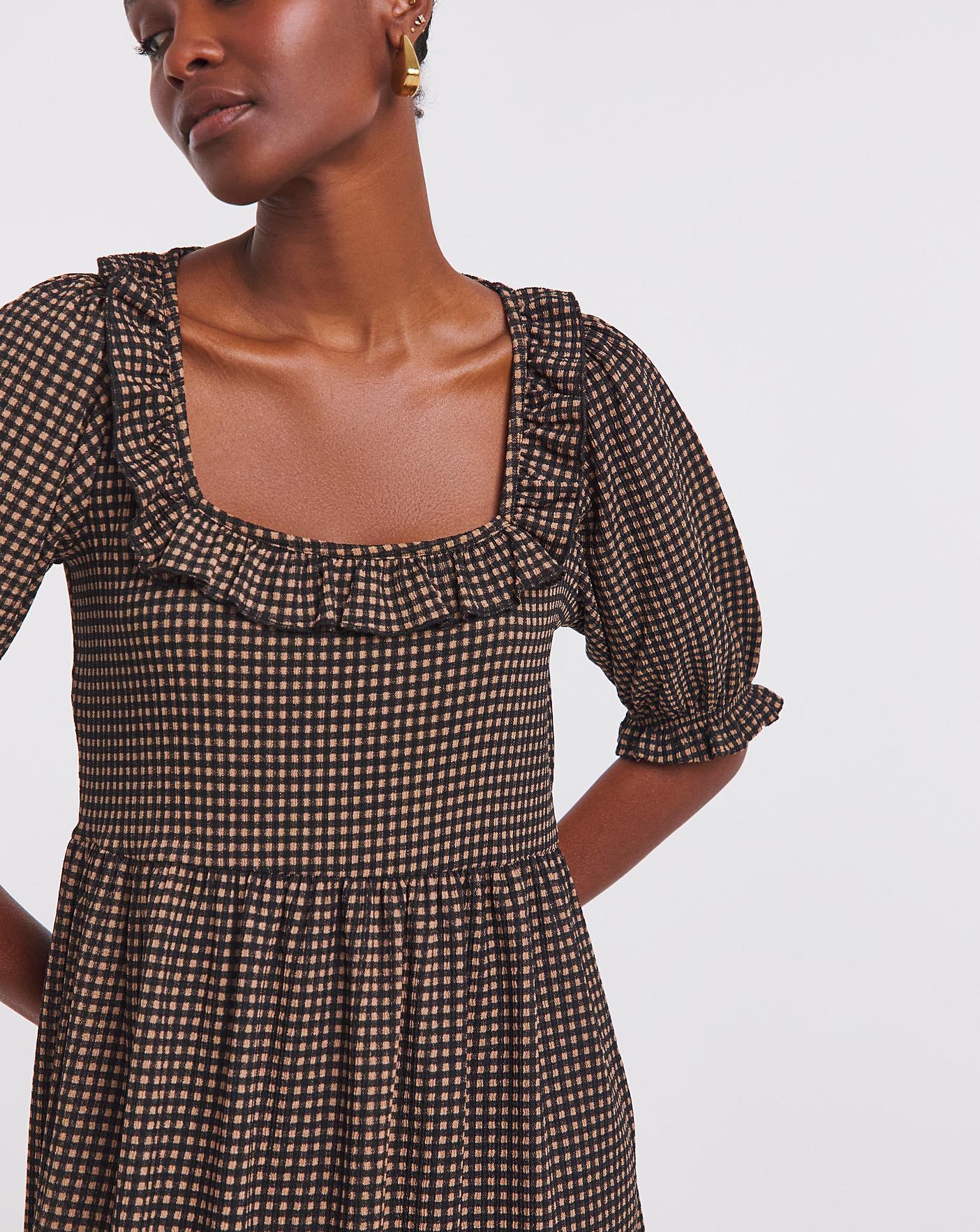 Shop our Historic Detail Waffle Skater Dress this season! Square neckline. Mono gingham fabrication. Comes in a breathable waffle fabric. Skater style dress. Short, puff sleeves.