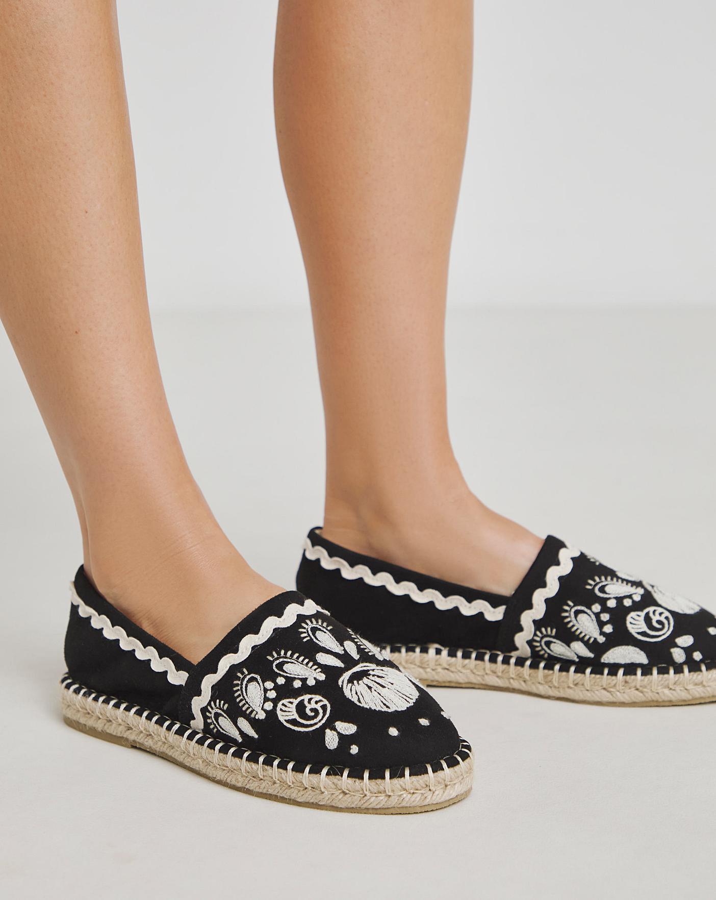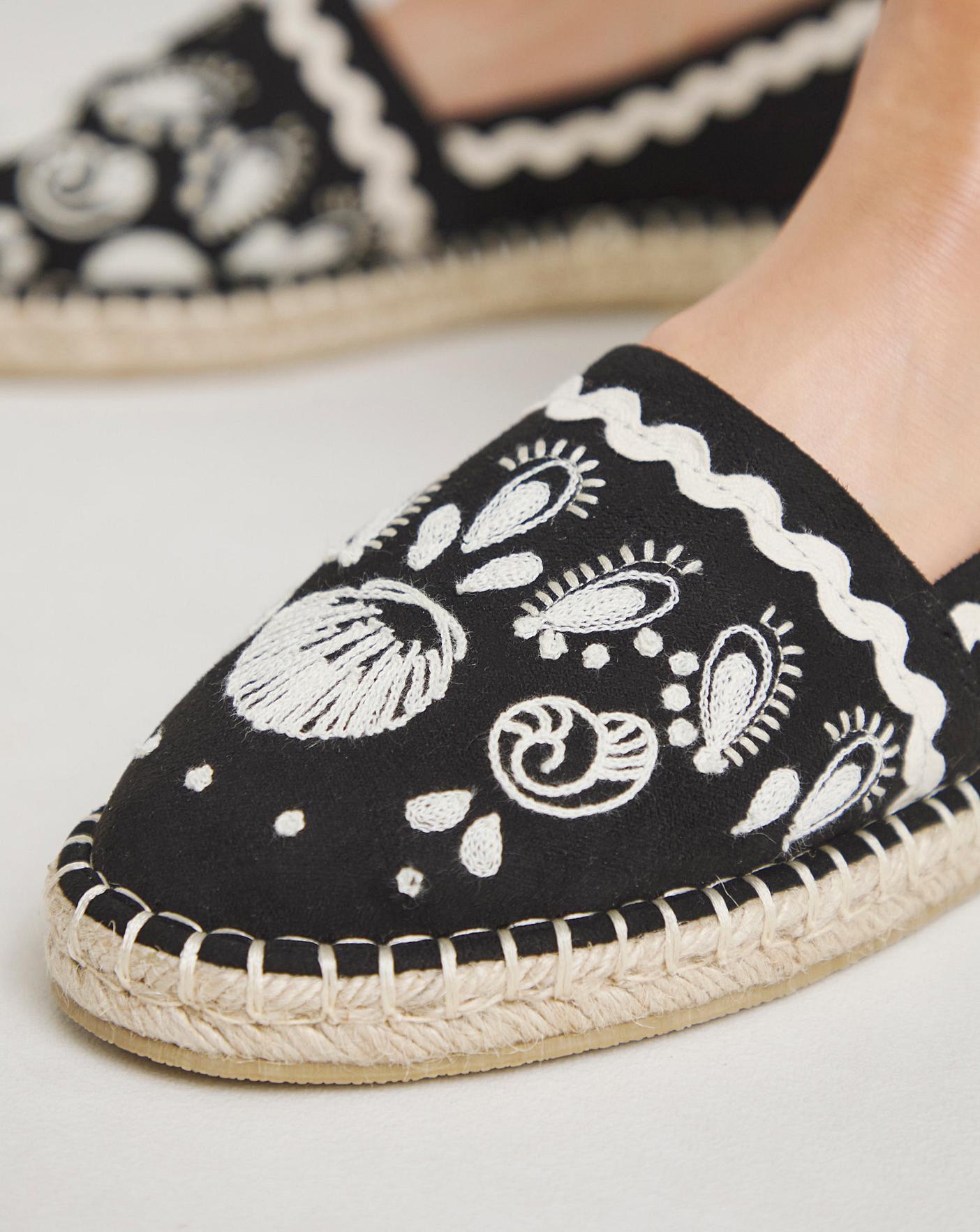 These espadrilles are perfect for adding some sunshine to any outfit. Embroidered detailing, easy slip on style & flat raffia sole.