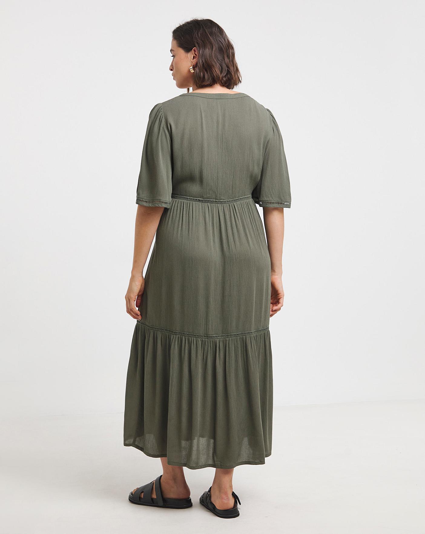 The perfect addition to your everyday wardrobe this season. Shop this super cute dress featuring: V neckline. Midi length. Button down front detail. Tiered design. Simply pair with sandals for an effortless everyday look!