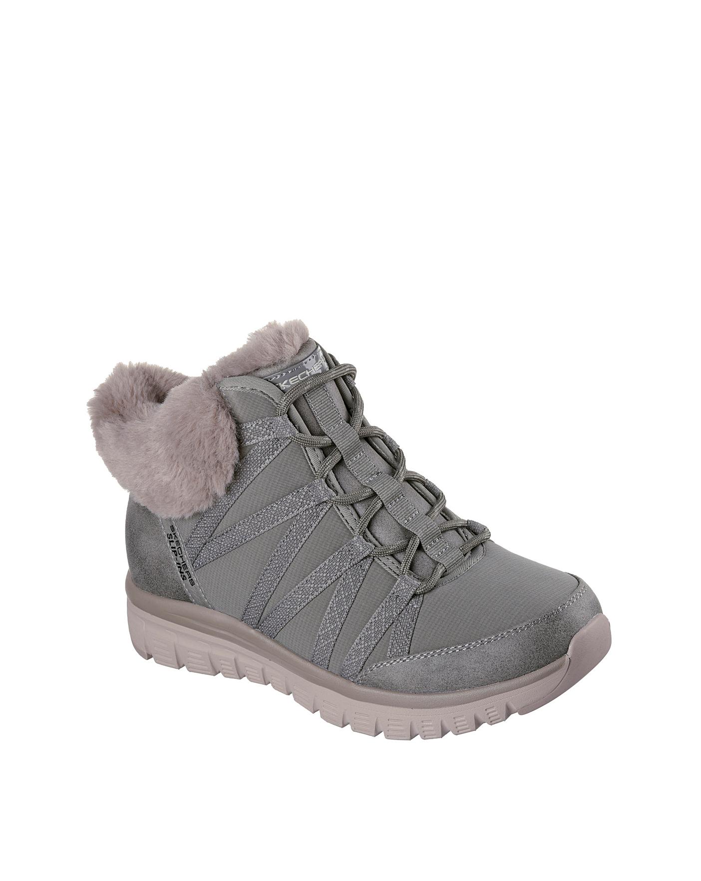 Grace your feet with easy wearing comfort in Skechers Hands Free Slip ins Graceful Cozy Strolls. Designed with our exclusive Heel Pillow, this bootie features a 3M Scotchgard treated woven fabric, faux fur trim, stretch laces, and a cushioned Skechers Air Cooled Memory Foam insole. Exclusive Heel Pillow holds your foot securely in place, Skechers Air Cooled Memory Foam cushioned comfort insole, Treated with 3M Scotchgard to resist water and stains.