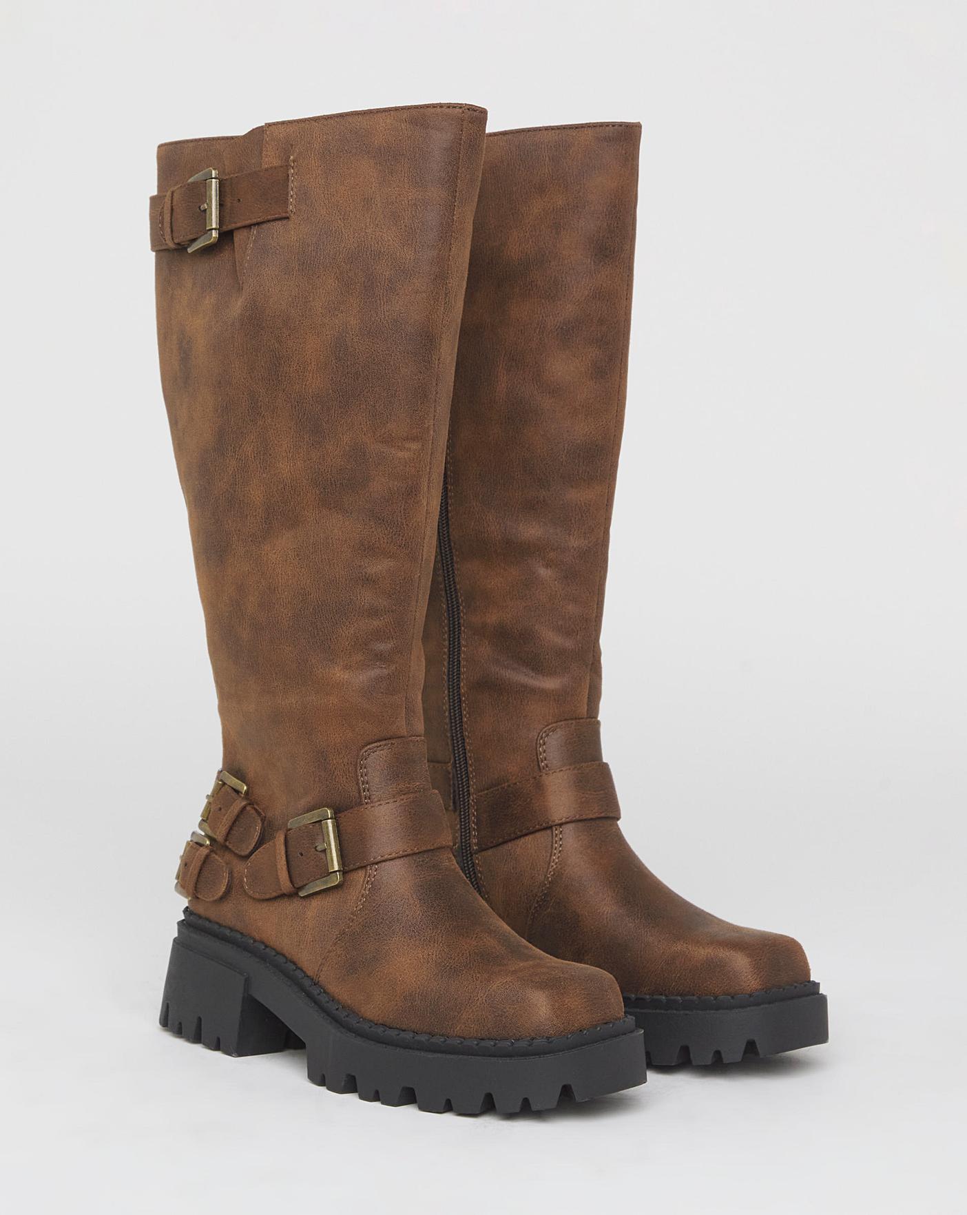 Biker boots are here to stay, get yours now. Chunky square toe outsole Adjustable buckle fastenings Inside leg zip for ease Cushioned sock for ultimate comfort